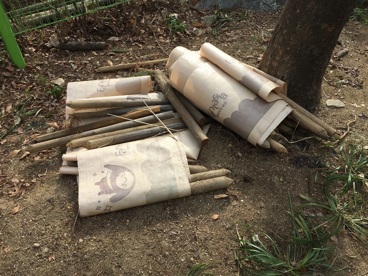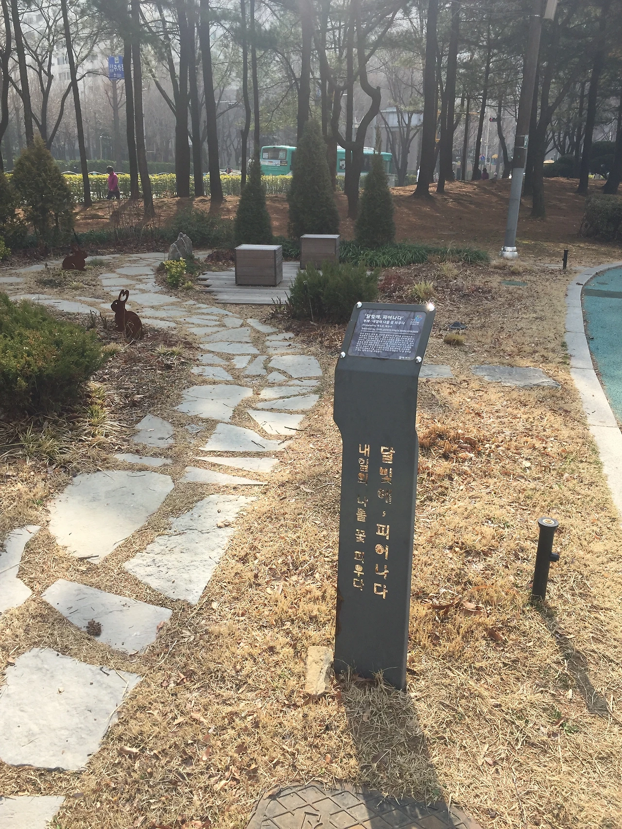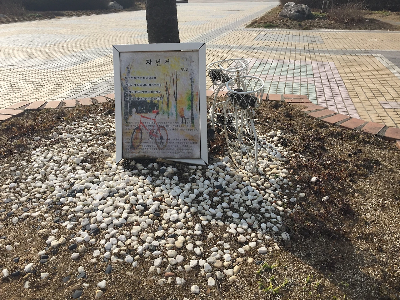 예초기로 마른풀들을 잘라내고 있었다. 산발한 머리카락을 잘라내는 느낌이다. 내가 이발하는 것처럼 시원했다. 이어 포대에 거둬낸 낙엽들과 잘라낸 마른풀들을 쓸어 담아 길 가장자리에 나란히 세워 놓았다. 가지런한 포대자루가 따뜻한 햇살에 정겹다. 벼를 거두고 난 후 볏단을 쌓아놓은 논둑을 보는 것 같은 느낌이었다. 도시 한가운데서 만나는 시골이다.