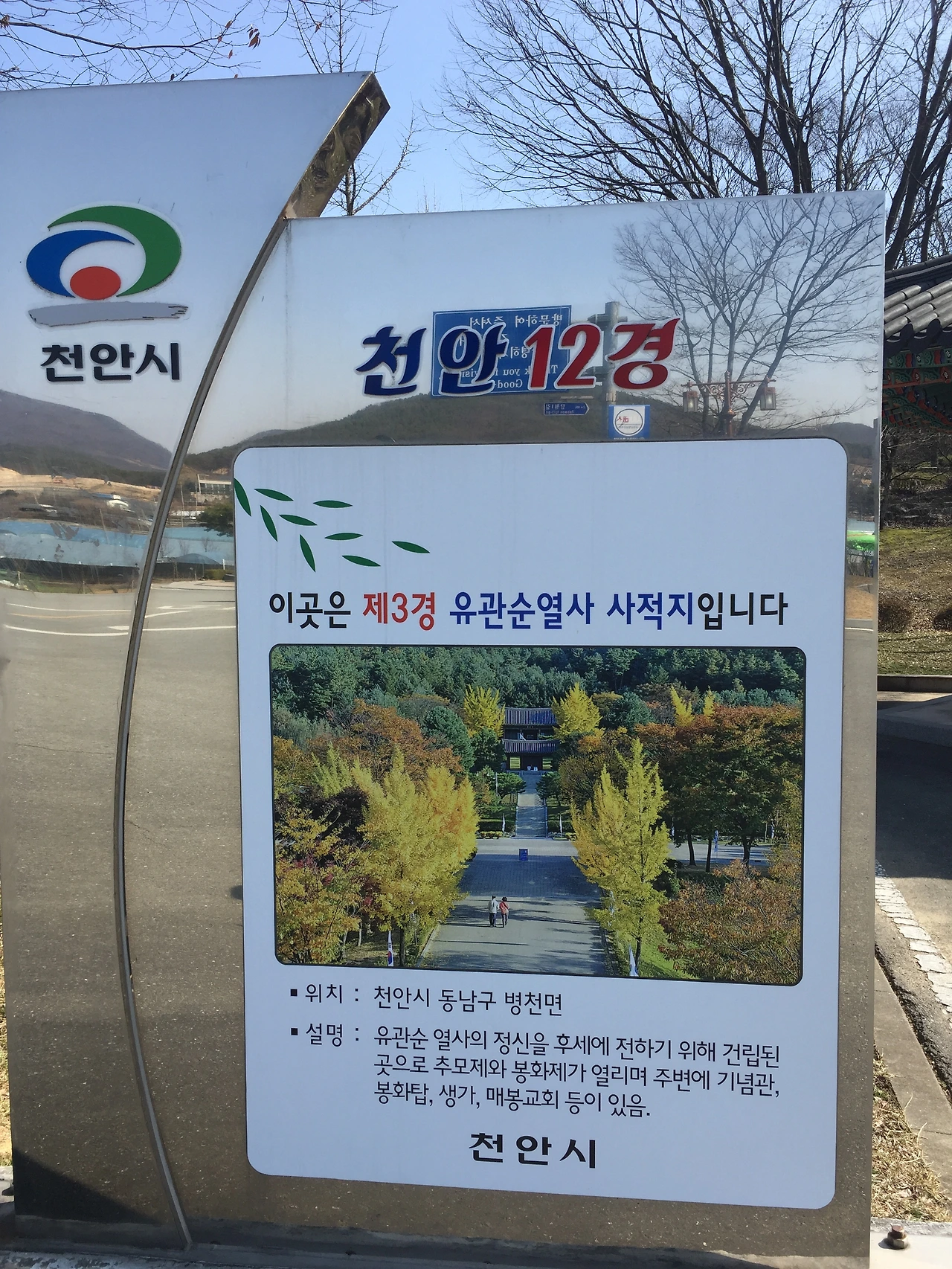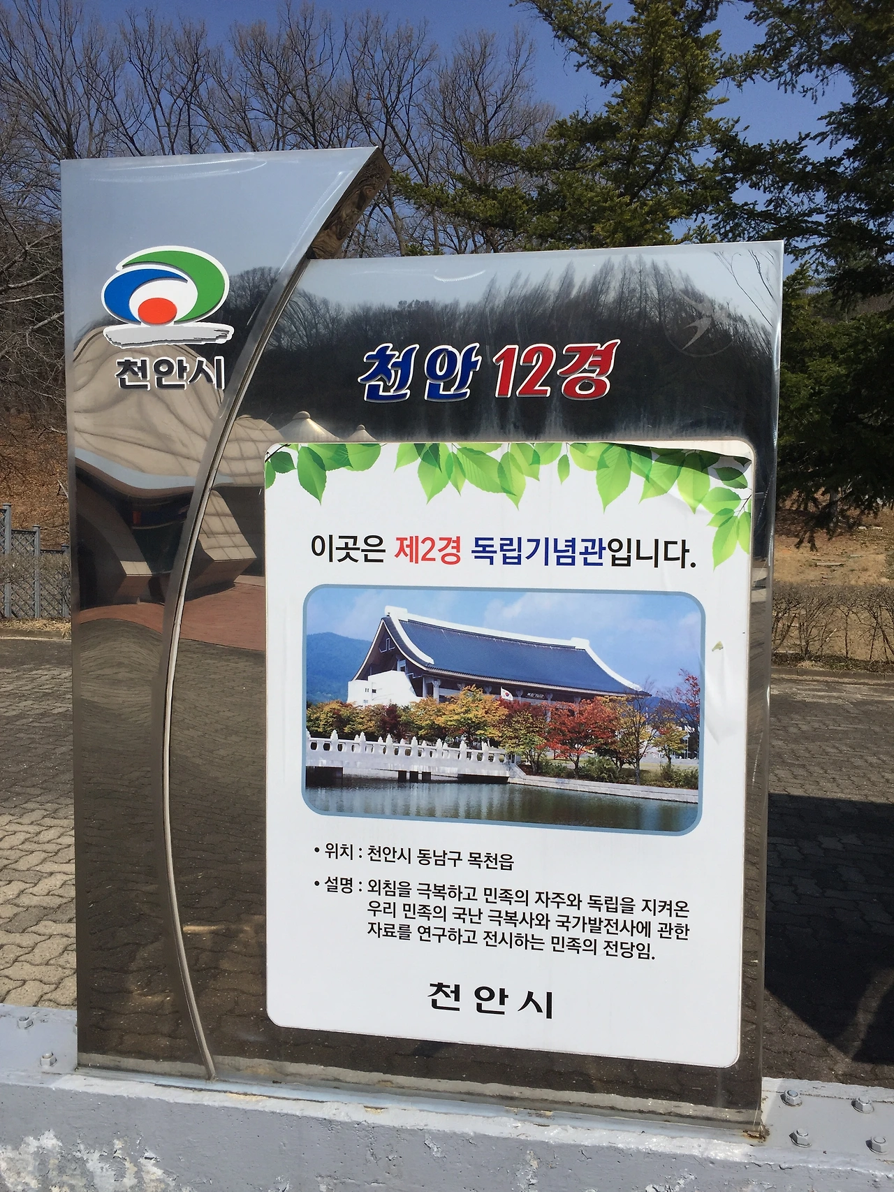 여유로운 주차장을 지나 입구에 도착하니 그제사 남편이 얘기했다. 오늘 휴관일이라고... 오면서 혹시 휴관일까를 잠깐 생각했지만, 설마 목요일이 휴관이겠어, 혼자서 생각했는데 요일의 문제가 아닌 코로나 때문에 2월 26일부터 휴관인 상태였다. 아쉬운 마음이 잠깐, 그래도 헛걸음이라는 생각은 갖지 않기로 했다. 기분을 끌어올렸다. 우뚝 솟은 상징물을 멀리서 찍으며 이 자리에 있는 것 자체가 중요하다고 생각했다. 다음에 와서 제대로 보면 된다고 생각했고 넓은 공간을 둘러보며 다음 기회를 기약했다. 이곳이 천안 12경 중 2경이라는 안내 표지가 있었다.