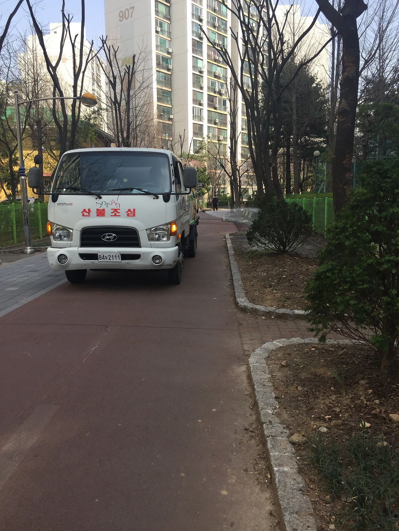 돌아오는 길, 아파트 사잇길 화단에 시에서 물을 뿌리고 있다. 날씨가 건조하기도 하고, 식물이 잘 자랄 수 있게 물을 주는 것 같기도 하다. 가까이 가서 보니 살수 차량 앞에 쓰인 글씨는 '산불조심'이다. 건조하면 건조한 대로 재난이 닥쳐올까 염려하여 대비하는 것 같았다. 지금 이 상황에 불까지 나면 정말 큰일이지 싶다.