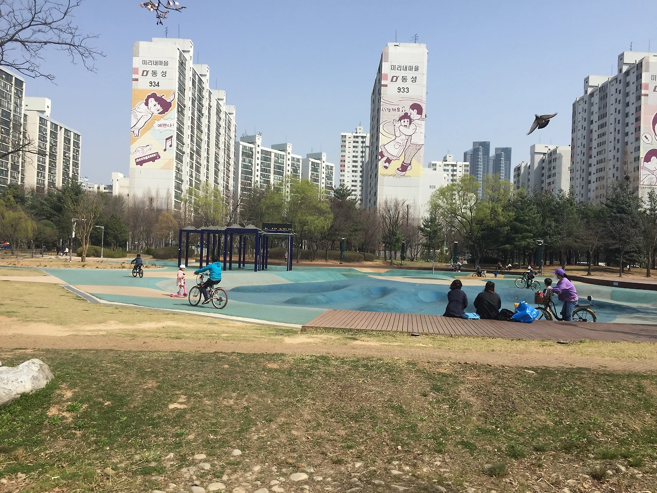 걷지를 못하니 멀리 돌아서라도 걷다 들어가자 싶어 일부러 빙 돌아오니 아이들이 자전거나 보드를 탈 수 있도록 조성해 놓은 공간, 아이들은 풀어놓고 놀게 하고 엄마들은 한쪽에 앉아서 아이들 노는 모습을 지켜보고 있다. 아이들은 자전거를 타고 빙빙 돌며 신나게 에너지를 발산한다. 하루 종일 뛰어도 지치지 않을 때니 데리고 나올 수밖에 없었을 것 같기는 하다. 지나며 들으니 매일 이곳을 나온다고, 옆에 앉은 아는 이를 향해 말한다. 이 정도는 괜찮은 건가 싶은 생각이 또 든다.