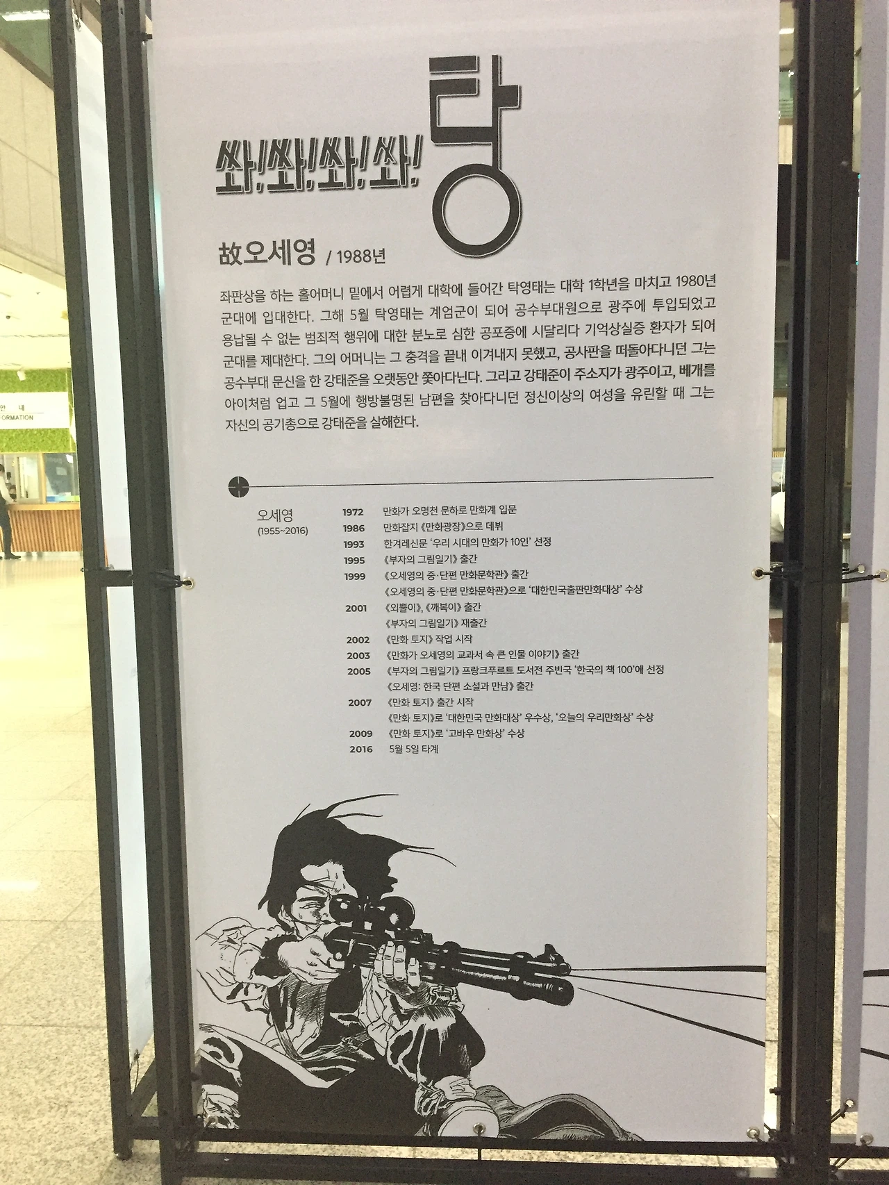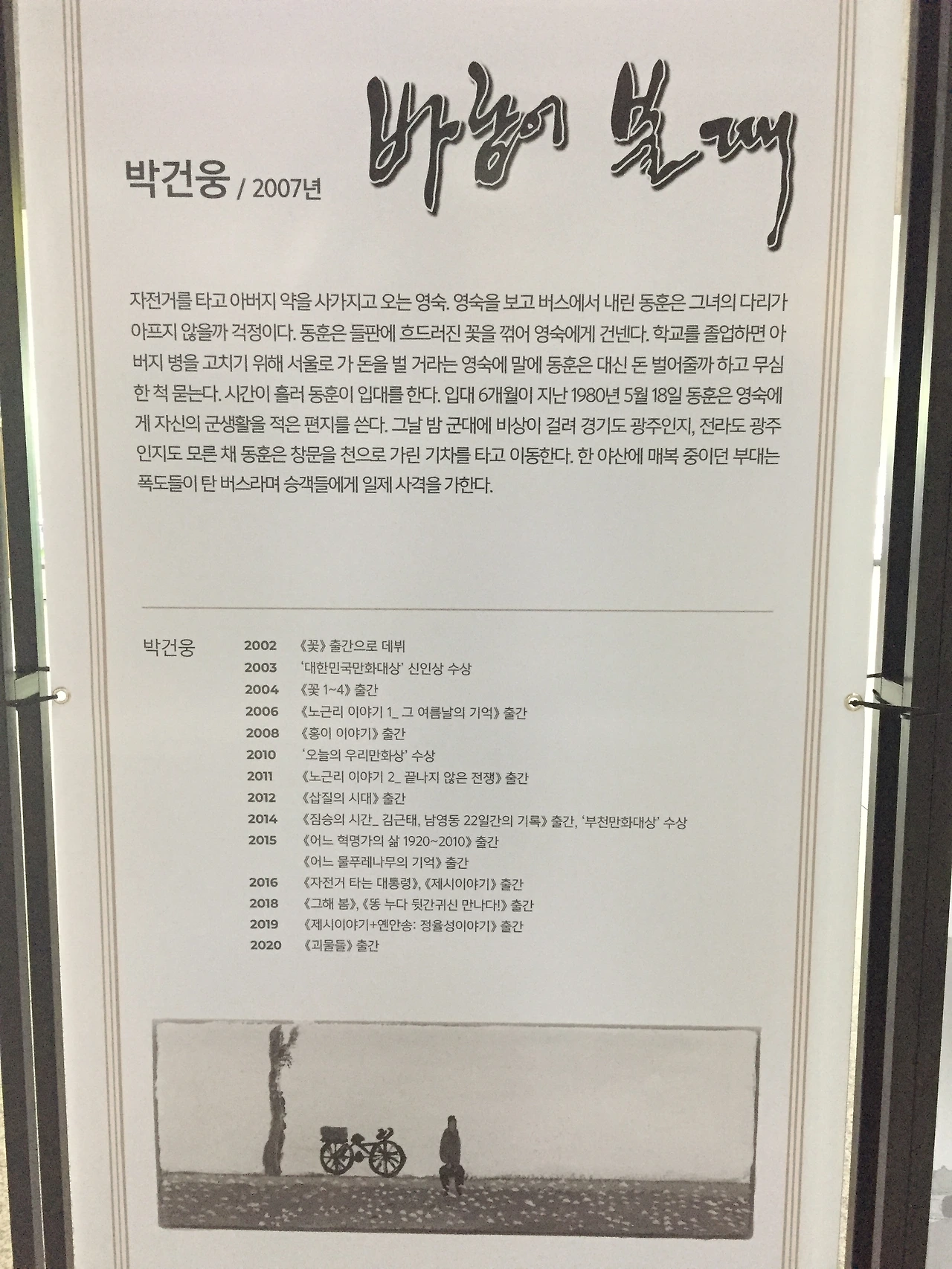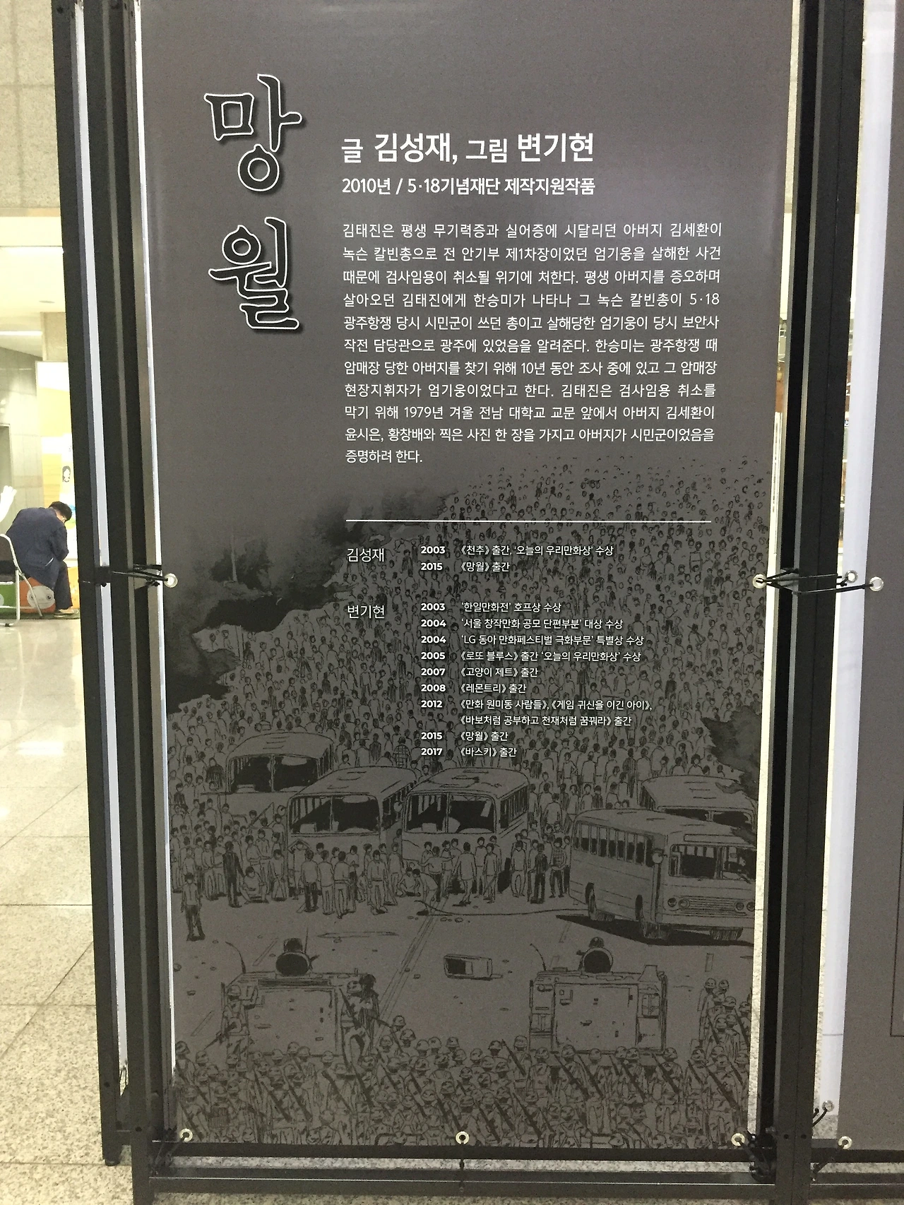 광주에서 돌아와 관련 기사를 기웃거리던 중, 마침 한국만화박물관에서는 5·18 민주화운동 40주년을 맞아 5·18과 관련된 만화를 기획 전시하고 있다는 사실을 알게 되었다. 5·18의 의의를 다시 새기고 희생자들의 숭고한 정신을 기리기 위해, 5·18이라는 역사적 비극을 사실적으로 또는 상상력을 가미하여 재현한 5편의 만화작품들이 전시된다. 만화의 사회적 역할을 제고하고, 작품에 등장하는 각 인물들의 이야기를 통해 5·18 이후 슬픔과 아픔을 가지고 살아가는 ‘사람과 사람과 사람들’의 삶의 무게를 읽어보고자 하였다, 고 주최 측은 말한다.