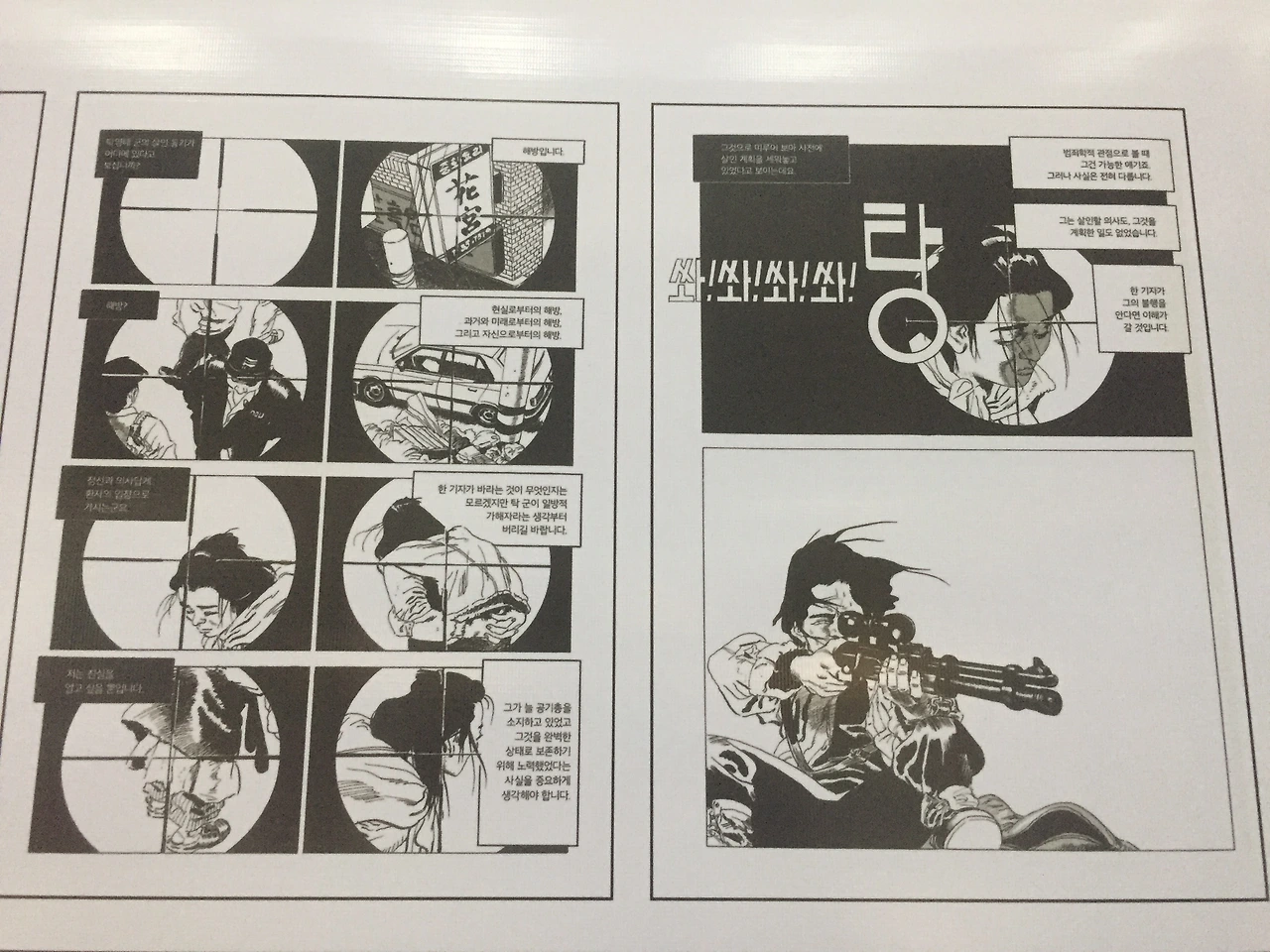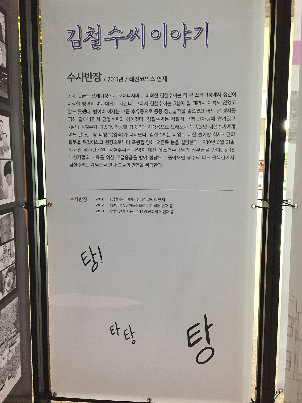 5·18을 다룬 만화 작품으로 내가 알고 있었던 강풀 작가의 <26년>이 전부였다. 처음 보았을 때의 충격을 잊을 수가 없다. 일목요연하게 정리해 주는 것처럼 나에게는 5·18의 교과서였다. 이번 전시를 통해 다른 작품들을 확인할 수 있다. 오세영 작가의 <쏴!쏴!쏴!쏴! 탕>, 박건웅 작가의 <바람이 불 때>, 김성재·변기현 작가의 <망월>, 그리고 수사반장의 <김철수 씨 이야기>가 같이 전시되는 작품들이다. 작품에서는 국민을 보호할 의무가 있는 국가가 오히려 무고한 국민들을 빨갱이라며 짓밟고 살상하는 일이 벌어지는 현실을, 권력은 진실을 덮으려고만 하는 실상을 이야기한다.