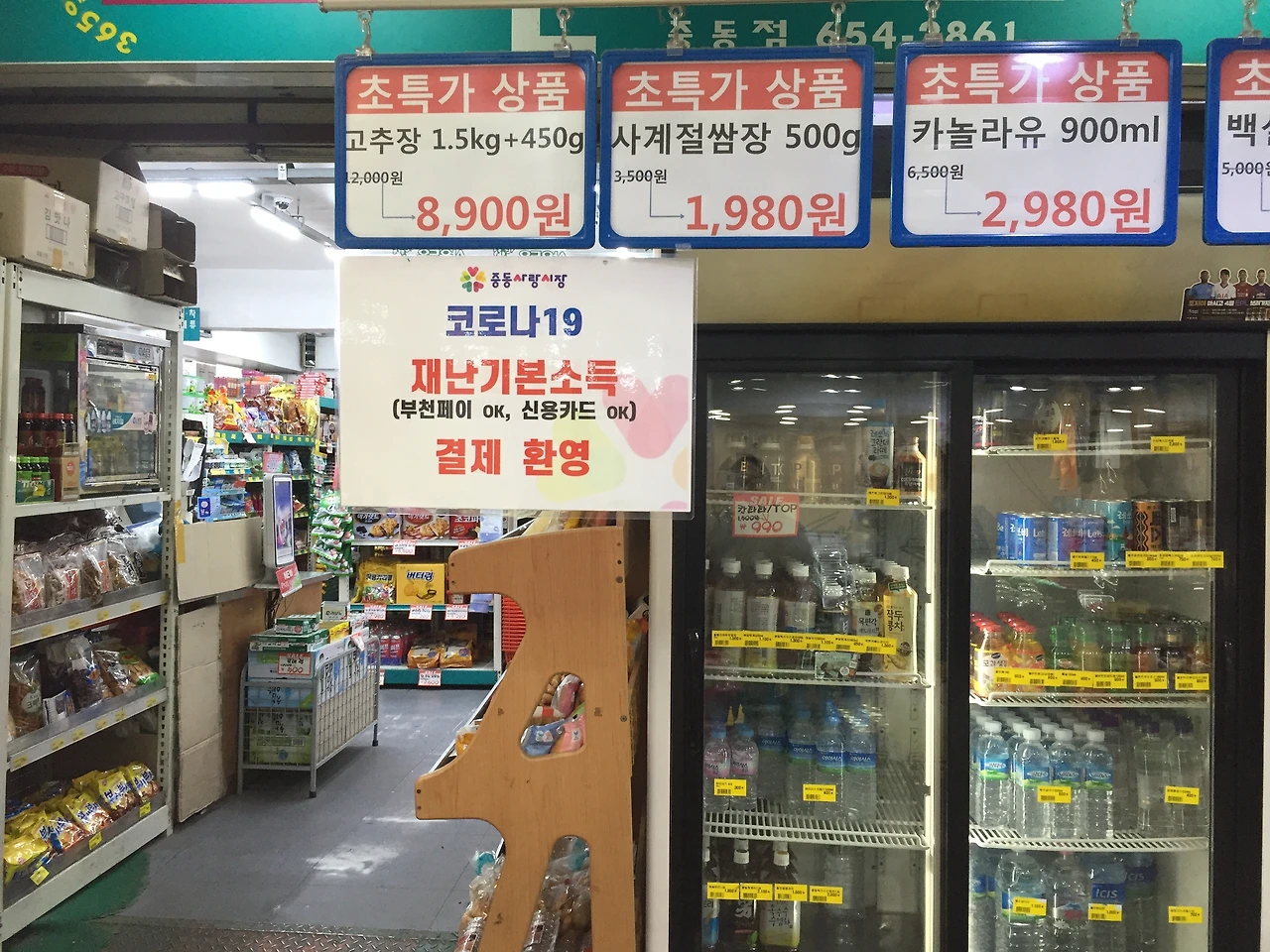 장을 보러 나온 사람들의 표정이나 시장 상인들의 모습 모두 생기가 있어 보였다. 상인들의 호객 소리도 유난히 크고 힘찼다. 가게마다에 역시 먹자골목에서 본 '지역화폐, 재난지원금 사용 가능' 팻말이 붙어 있었다. 사람들의 문의가 많아서 붙여 놓은 것인지, 재난기본소득이 입금이 되었다는 것을 알고 사용을 유도하기 위해 붙여 놓은 것인지, 무튼 재난지원금이 시장의 경기 활성화에 큰 영향이 있는 것은 틀림없는 것 같았다.