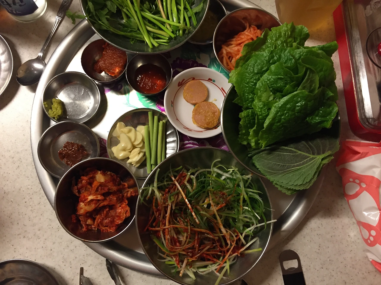 저녁도 숙소 근처에 있는 음식점을 찾았다. 마침 근처 고깃집에 사람들이 줄을 서서 기다리고 있었다. 나름 맛집이었던지 관광객은 아닌 듯한데 손님이 많았다. 꽤 오랜 시간 기다려서 드디어 우리 차례가 되었고, 소박한 상차림에 냉동 고기가 기계로 썰어져 둥글게 말아져 나오는 집이었다. 개인적으로는 두툼한 생고기보다는 얇은 냉동 고기를 선호하는 편이었고, 거기에 파채 듬뿍 그리고 특이하게 미나리가 한 접시 나왔다.