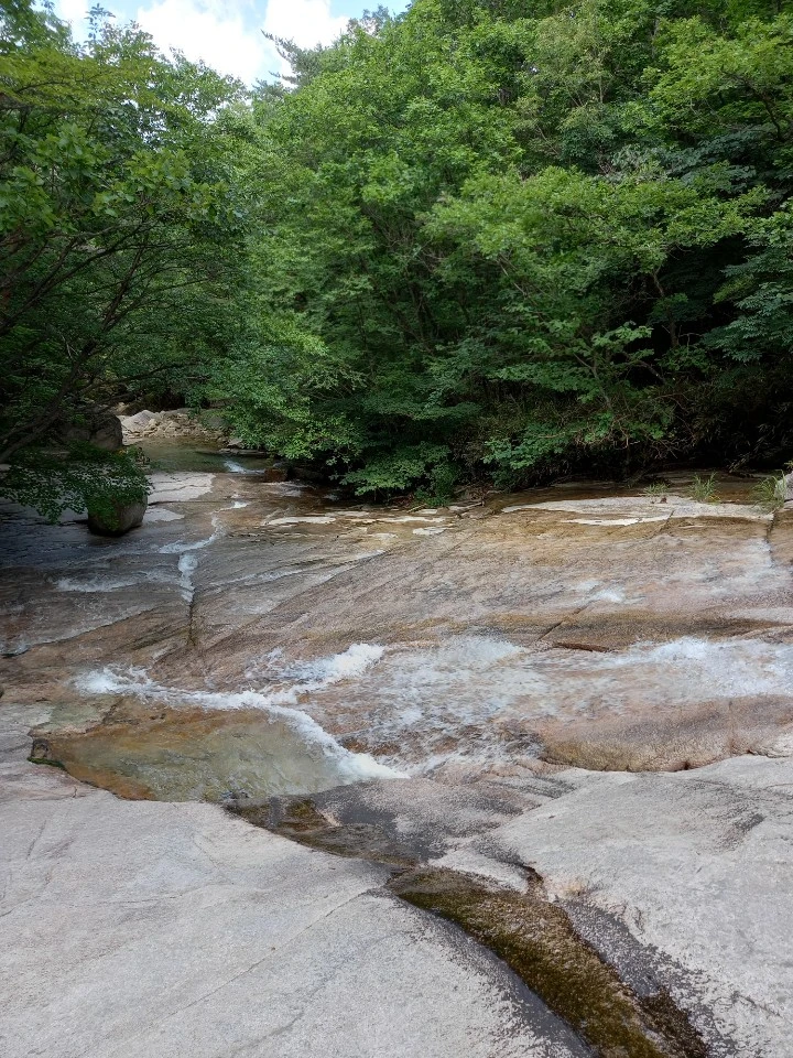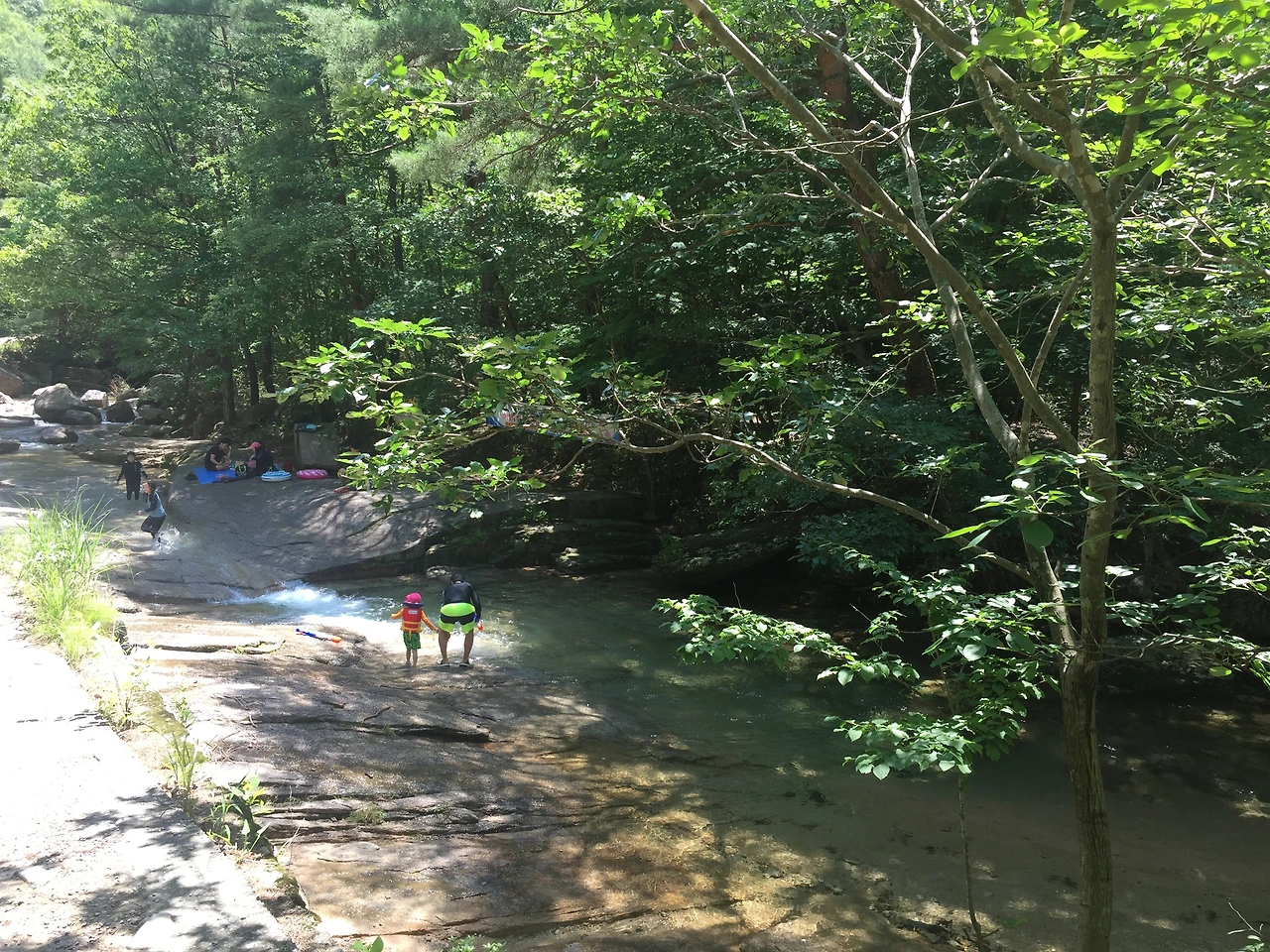 계곡을 끼고 걷는 길에 다람쥐도 만나고 가족들이 놀러 와서 물놀이를 즐기는 모습도 볼 수 있었다. 크고 넓은 바위와 그것들을 끼고 흐르는 계곡물은 아이들과 함께 즐기기에 딱 좋아 보였다. 내려오는 길에 우리도 계곡물에 발을 담그고 한참을 앉아 있었다. 올여름의 더위를 이길 만큼 충분히 즐겼다는 생각이 들 때까지.