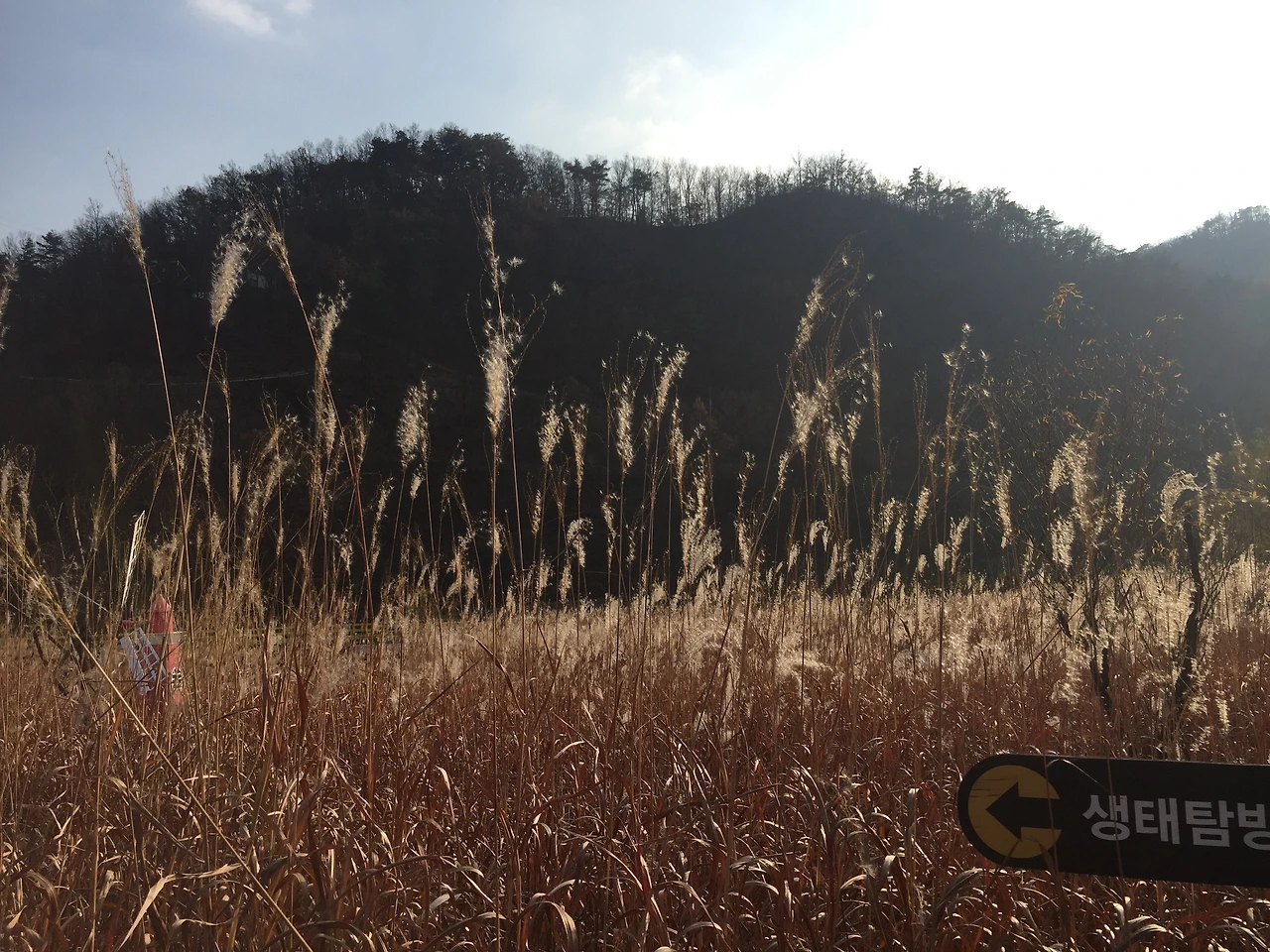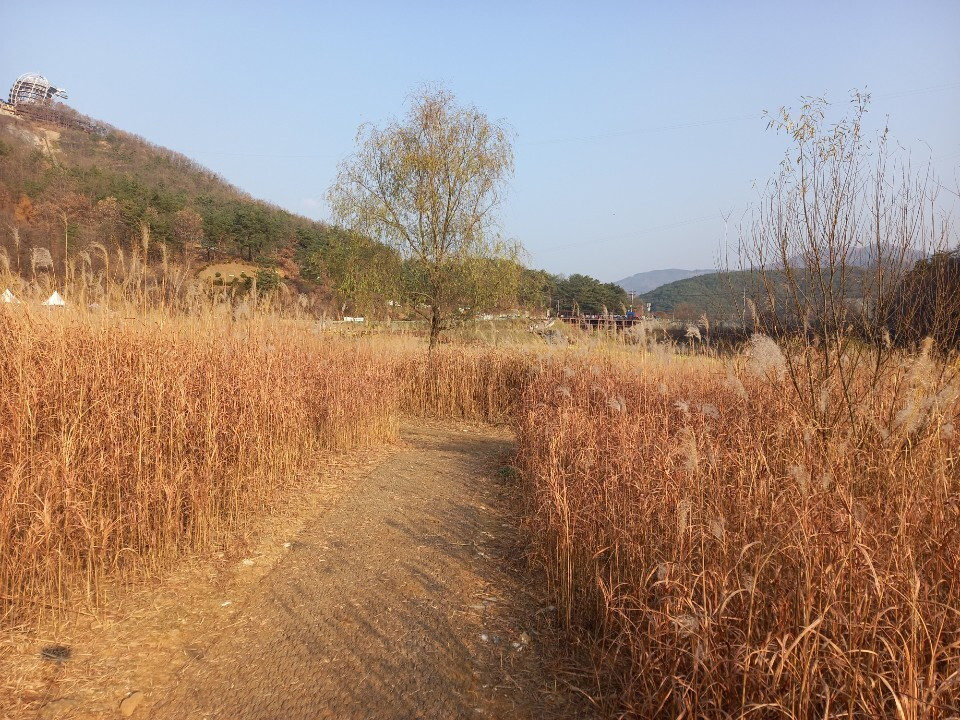 주차장 인근은 수양개 근린공원으로 조성되어 있었다. 생태숲길에는 갈대숲이 조성되어 있었다. 출사의 명소로 떠오르는 곳, 인생 사진을 건질 수도 있다. 늦가을 갈대숲은 현실이 아닌 느낌이었다. 주차장 건너편으로 가면 만천하 스카이워크 바로 밑이다. 강을 따라 조성된 잔도 길을 걸으며 마음을 차분하게 가라앉힐 수 있었다. 1.2km 구간이 나무로 깔려 있어 걷기에 편했다. 단풍이 한창일 때였으면 더 예쁜 풍광을 보았겠지만 강가를 따라 걷는 정취만으로도 퍽 운치가 있었다. 풍경에 어울리는 음악도 낮게 흘러나왔다.
