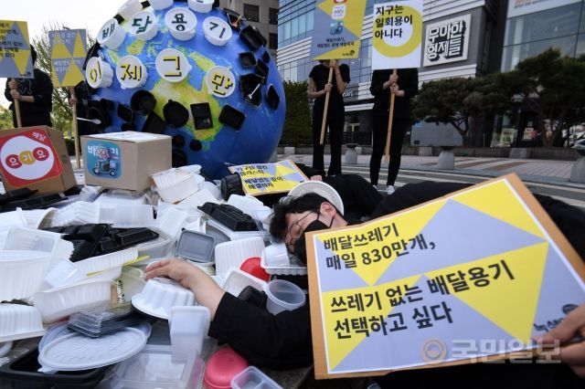 지난 두 달 동안 배달음식을 먹지 않았다. 환경 문제를 생각하고부터는 더 신경이 쓰인다. 마트나 시장에서 매번 '용기'를 내지는 못하더라도 쓰레기를 배달받지는 말자고 생각하고 있다. 오전 11시, 집은 나서는 데 누군가가 주문한 음식이 마침 배달되고 있다. 곧 쓰레기로 배출될 플라스틱과 함께.