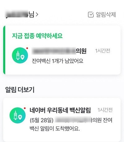 ▲ 잔여백신 알림 온라인 신청 다음날 잔여백신 알림이 왔다.
