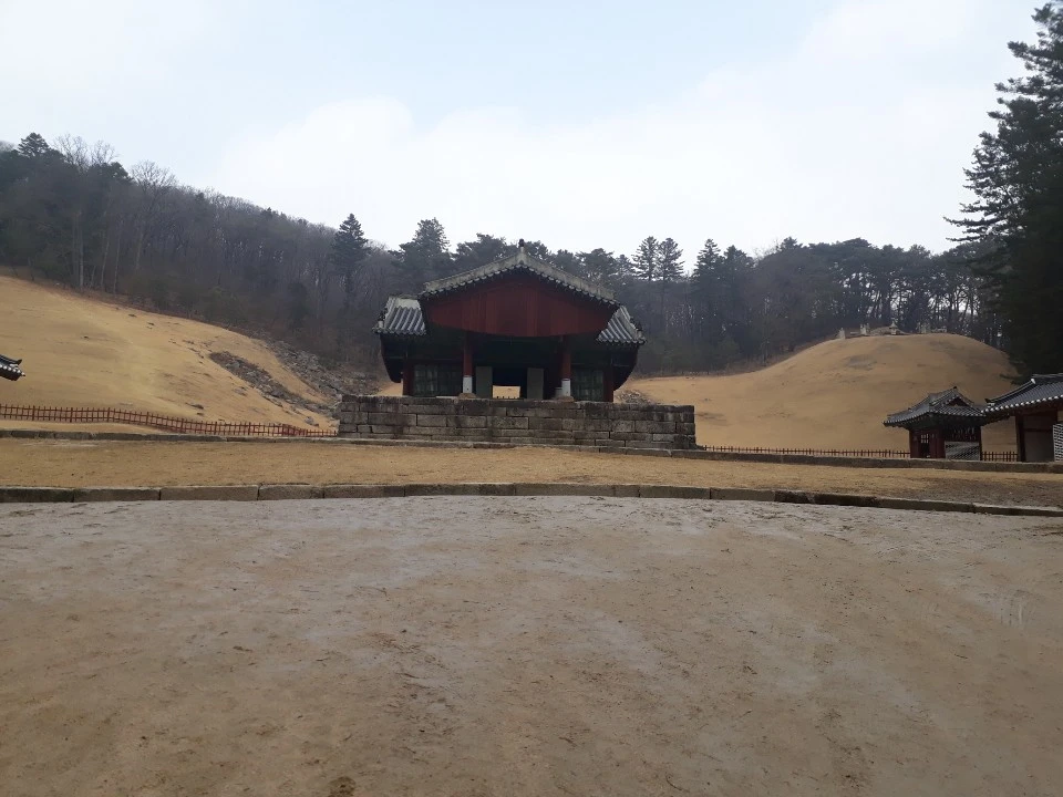 정자각에서 능이 있는 곳으로 향하는 능선과 탁 트인 시야가 고즈넉하고 멋스러웠다. 왕릉이 위치하기에 충분히 넘치게 좋은 장소라는 생각이 들었고, 그 시절 빽빽하게 나무들이 들어선 산속에서 어떻게 이런 장소를 찾았을까 싶었다. 안내 책자는 단풍이 막 들기 시작하는 가을, 능까지 오르는 진입로의 전경이 찍혀있었지만, 나뭇잎 하나 남아있지 않은 포근한 겨울의 고요한 풍경도 충분히 멋스러웠다. 얼음이 녹아 질척한 땅을 피해 밟으며 올라갔다.