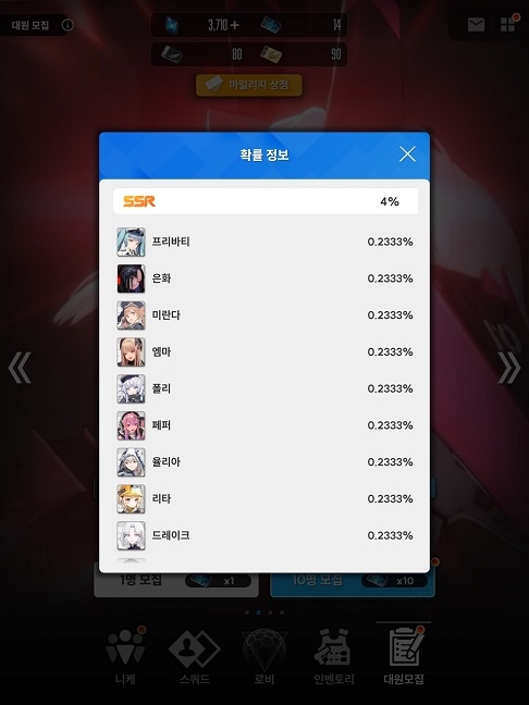 하지만 그러기엔 가차 확률이 너무나 가혹하다. 일반모집 기준으로, SSR의 경우 전체 확률이 4%이며, 해당 등급의 니케들 각자의 확률은 고작 0.2333%에 불과하다. 픽업 기간에 등장하는 특수 모집 같은 경우, SSR 전체 확률은 4%로 동일하며, 픽업 대상 니케는 2%, 나머지는 0.0395%으로 일반모집이든 특수 모집이든 같은 니케를 10장이나 뽑는 건 하늘의 별따기나 마찬가지이다. 그렇기 때문에, 무과금을 하는 유저들은 금세 한계점에 도달해버리고, 과금을 하는 유저들은 울며 겨자 먹기로 극악의 확률을 뚫기 위해 거금을 투자하게 된다. 게다가 이 게임에는 '필그림'이라는 존재의 니케들이 있다. 이 '필그림'에 속한 니케들의 경우, 선진 기술이 탑재된 니케라는 설정에 맞춰 동급의 타 SSR 니케들보다 성능이 뛰어나다. 그리고 그런 만큼 가차 확률도 상당히 낮다. 일반모집과 특수 모집에서 '필그림'을 뽑을 수 있는 확률은 0.0833%로, 같은 니케 10장을 모으는 난이도가 한 층 더 올라가 버린다. 그리고 가차 게임의 대명사라 할 수 있는 천장 시스템이 존재하지 않는다는 점 또한 이 게임의 극악무도함에 크게 이바지하는 요소 중 하나이다.