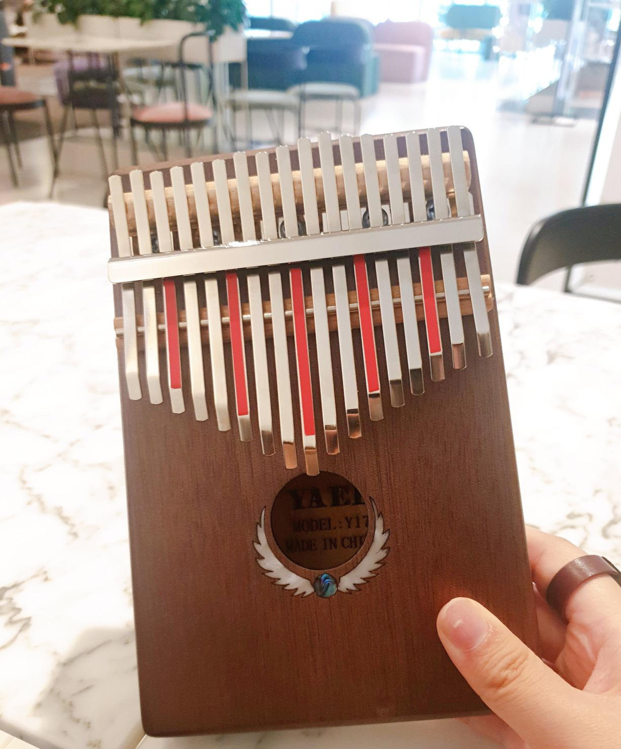 연주 방법은 아주 간단하다. 양 손으로 칼림바를 잡고, 엄지 손가락 두 개를 이용해 건반을 튕겨주면 된다. 정중앙 가운데 건반이 낮은 도. 바로 좌측이 레, 우측이 미. 이런 식으로 중앙을 기준으로 좌우를 번갈아가며 조금씩 음계가 올라간다. 건반이 길수록 낮은 소리가, 짧을수록 높은 소리가 난다. 건반을 튕길 때 나는 소리는 꼭 오르골을 닮았다. 연주 방식이 피아노와 비슷한 느낌이라 어릴 적 피아노 학원을 다녀본 직장인이라면 쉽게 익숙해질 수 있을 것이다.