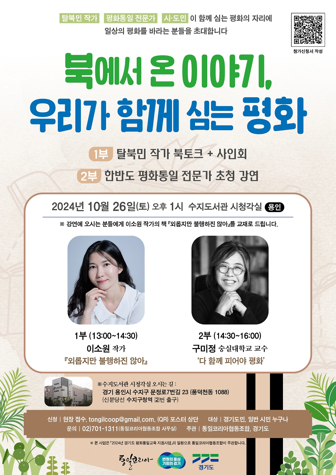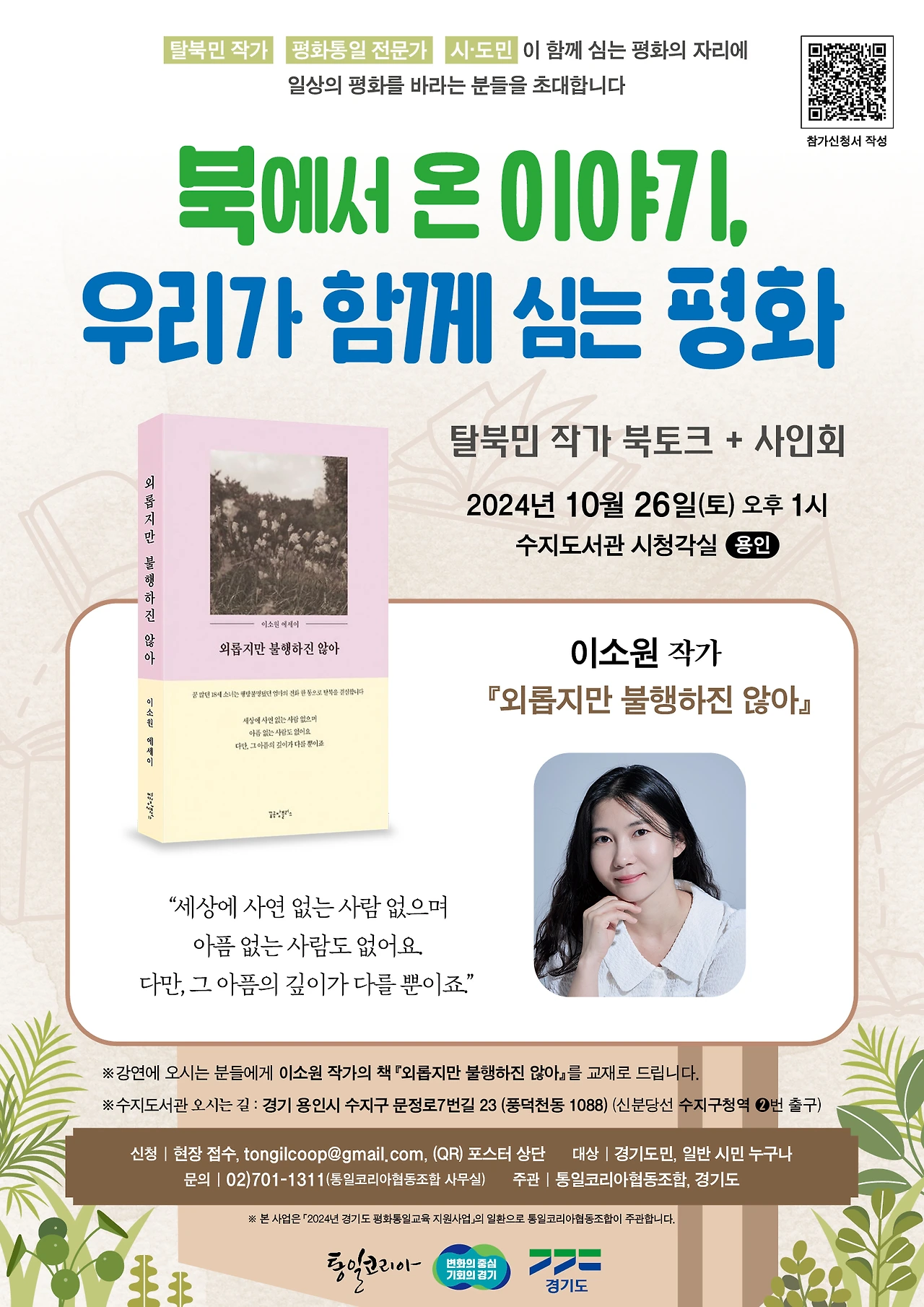 “북에서 온 이야기, 우리가 함께 심는 평화”라는 주제로 1.2부로 나눠서 진행하는데요, 저는 1부 순서로 북토크를 진행하고 2부에는 한반도 평화통일 전문가님의 강연으로 진행됩니다:)