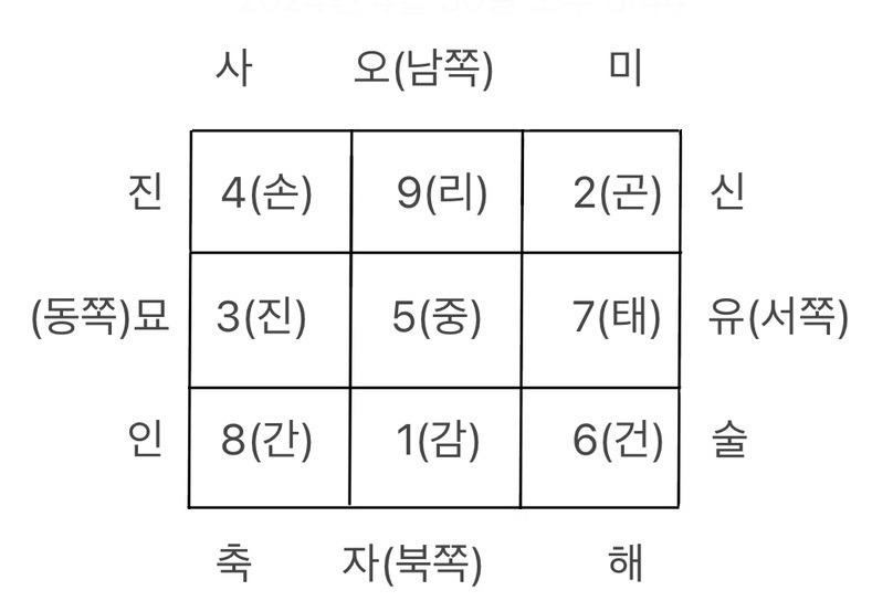 자가 있는 북쪽을 감궁, 미와 신이 있는 자리를 곤궁, 묘가 있는 자리가 진궁... 이런 식으로 궁의 이름과 위치, 숫자가 돌아가는 순서를 잘 알아야 구성판을 쉽게 그릴 수 있다. 가령 중궁에 7이라는 숫자가 오면 건궁은 8, 태궁은 9가 되고, 중궁에 3이 오면 손궁에 2, 진궁은 1이 된다. 감궁에 5가 오면 곤궁은 6, 진궁은 7, 손궁은 8이 된다