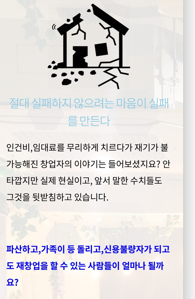 “자유리. 감정 문제를 해결한다고 고객은 관심을 두지 않을거에요. 오히려 가장 중요한 포인트는 사람들의 ‘두려움’을 끄는 것입니다. 감정문제의 해결은 그 어떤 두려움도 주지 않죠. 그래서 저와 같은 경우에는 그 사람이 진짜 아픈 부분을 건드리는 것으로 랜딩페이지를 시작합니다. “절대 실패하지 않으려는 마음이 실패를 만들어요.” 이렇게 창업시장에서는 누구나 실패하지 않으려고 마음을 먹기에 그들이 잘 드러내지 않는 불안한 문제점을 건드려주는 불편한 사실을 제안하는 것이죠.”