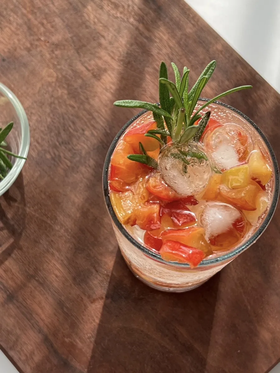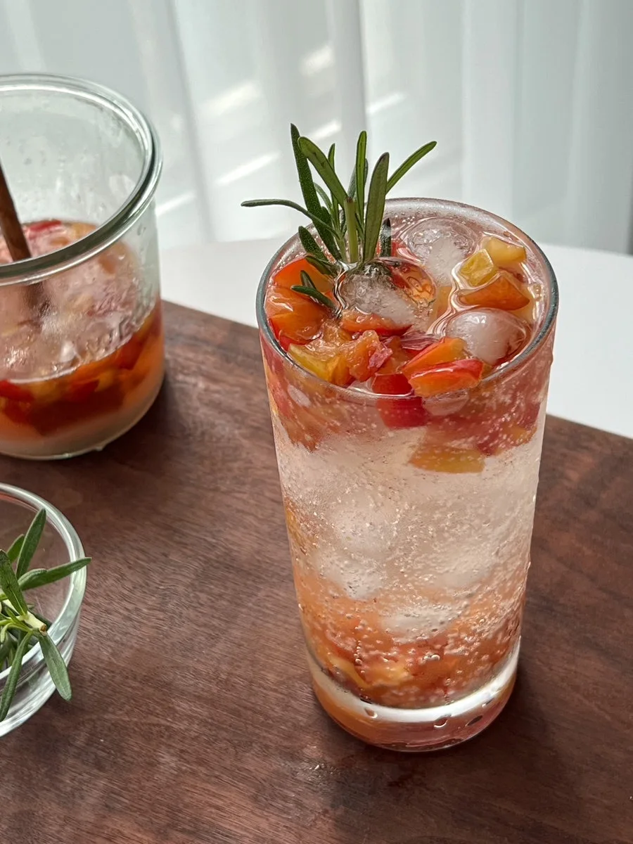 얼음을 채운 잔에 탄산수와 자두청을 듬뿍 넣어