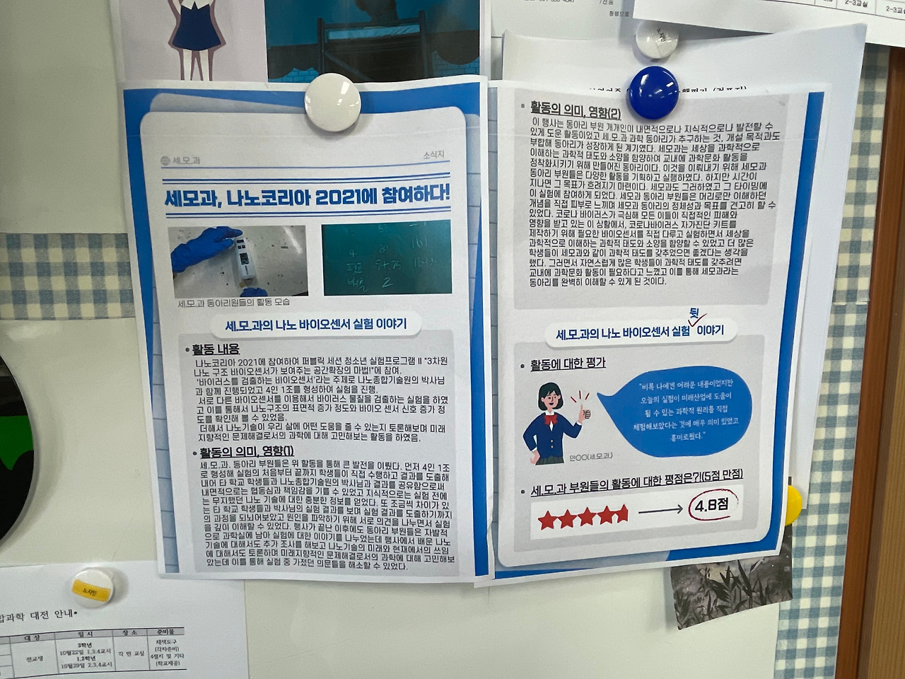 지난 7월 7일부터 9일까지 제19회 국제 나노기술심포지엄 및 융합전시회, NANO KOREA2021이 개최되었다. 우리 세모과는 이 전시회에서 청소년을 대상으로 한 온라인 실험 프로그램이 진행된다고 하여 참가 신청을 하였고, 운이 좋게도 선정되어 퍼블릭 세션 청소년 실험 프로그램Ⅱ, "3차원 나노 구조 바이오센서가 보여주는 공간 확장의 마법!"에 참여하였다.