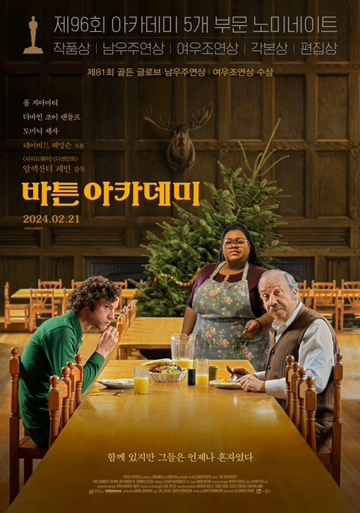 영화 ‘바튼 아카데미’는 무언가에 상처받아 마음이 까칠까칠한 세 명의 주인공이 등장한다. 배경은 1970년대, 유명 사립 기숙학교인 바튼 아카데미. 크리스마스 휴가를 맞아 대부분의 학생들이 집으로 떠날 생각에 들떠 있다. 그렇게 하나 둘 아이들을 떠나고 텅 빈 학교에는 외골수 역사 선생님 ‘폴’, 문제아 ‘털리’, 주방장 ‘메리’만 남는다. 왕눈깔이라는 별명의 폴은 융통성이라고는 없는 FM 같은 고집불통의 역사 선생님이다. 자신이 정한 기준에 도달하지 못하면 성적도 가차 없이 준다. 털리는 성적은 좋지만 친구들과의 관계는 기준 미달이다. 크리스마스 휴가만을 기다렸지만 엄마는 재혼한 남편과 신혼여행을 떠나야 하니 혼자 지내라고 통보한다. 안 그래도 비뚤어진 마음에 더 단단히 골이 났다. 평범해 보이는 메리는 남편을 잃은 이후 군에 입대한 아들마저도 전사한 나머지 마음에 상처가 깊다. 나이도, 성격도, 배경도 그 어느 하나 조화를 이루지 못하는 이들은 원치 않았던 동고동락을 시작하게 되고, 상처받은 이들이 그렇듯 처음엔 서로를 향해 날을 세우거나 자기만의 동굴에 갇히고자 한다.
