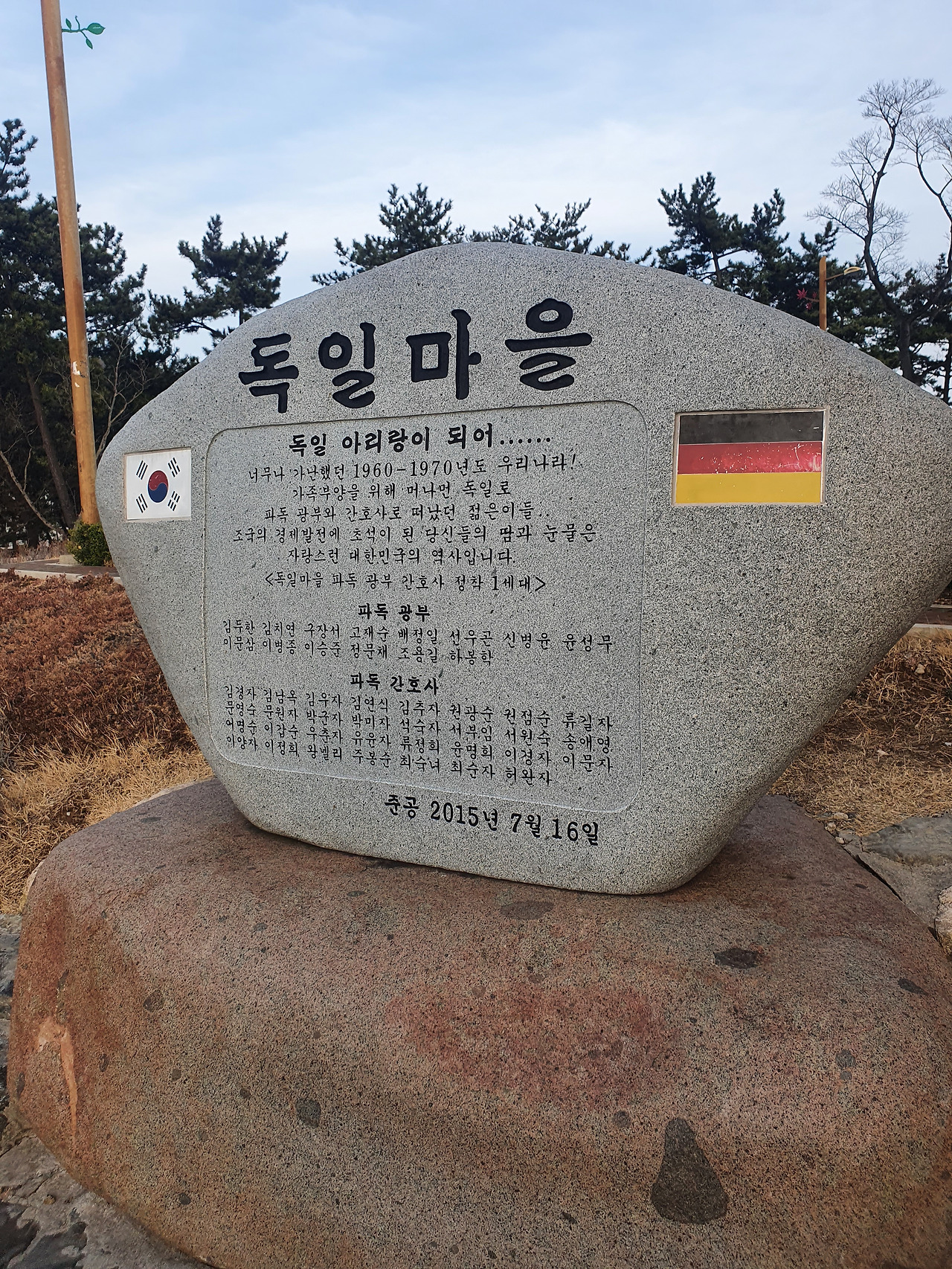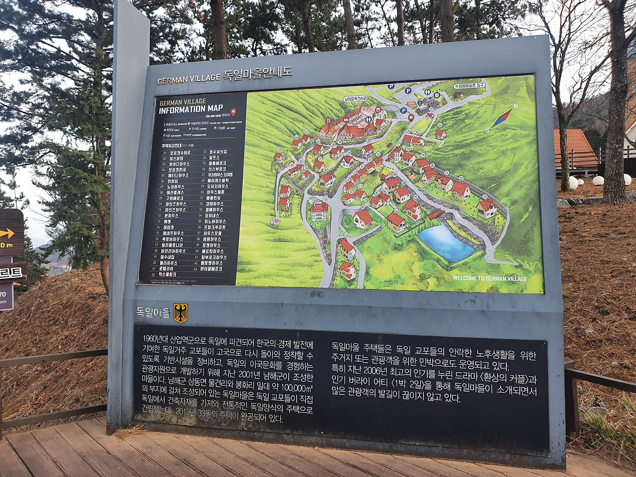 원예예술촌은 16개국의 집과 정원이 전시되어 있다고 한다.아쉬운 마음은 안내도로 대신했는데 짧게 알아보자면 독일마을의 유래는 이렇다. 우리나라 1인당 국민소득이 76달러에 불과하던 1960년 당시, 가난을 극복하기 위해 독일에 광부와 간호사 등으로 파견된 이들이 있다. 파독 광부, 파독 간호사라 칭한다. 이들은 어렵던 시절 먼 타국에서 돈을 벌어 고국에 송금하며 우리나라 경제발전을 도왔다. 시간이 흘러 우리나라도 어느 정도 경제발전을 이루게 됐고, 이들이 고국에 돌아와 노후를 보낼 수 있도록 남해에 마을을 만들었다. 10만m2(약 3만평) 정도 되는 부지에 독일에서 직접 건축 재료를 수입해 독일식 주택을 짓고, 독일을 알리는 공간도 마련했다. 2013년 33동의 주택이 완공됐고, 현재에 이르러 주거지 또는 관광객을 위한 숙박 업소으로도 운영되고 있다.