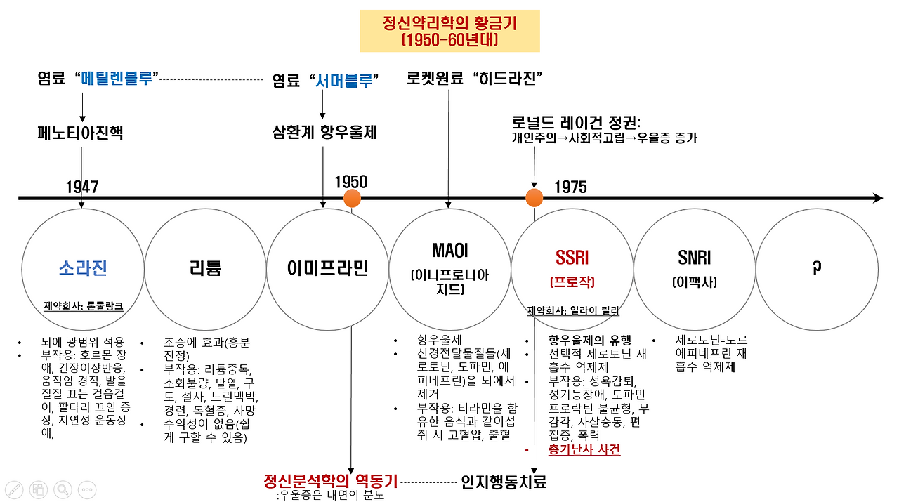 소라진 이후 1950-1960년대 초는 정신약리학의 황금기이다. 많은 신경전달물질이 발견되며 신약들이 쏟아져 나왔다.