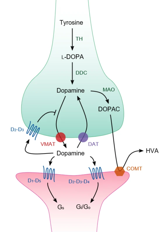 - 기능: 세포질에서 시냅스 주머니로 이동하여 축삭 말단에 저장 된 후 활동전압 작용에 의해 세포외배출되어 시냅스 틈으로 유리됨(그림2). 유리된 도파민은 시냅스이후 세포막에 발현된 도파민 수용체에 결합하여 효과를 나타냄