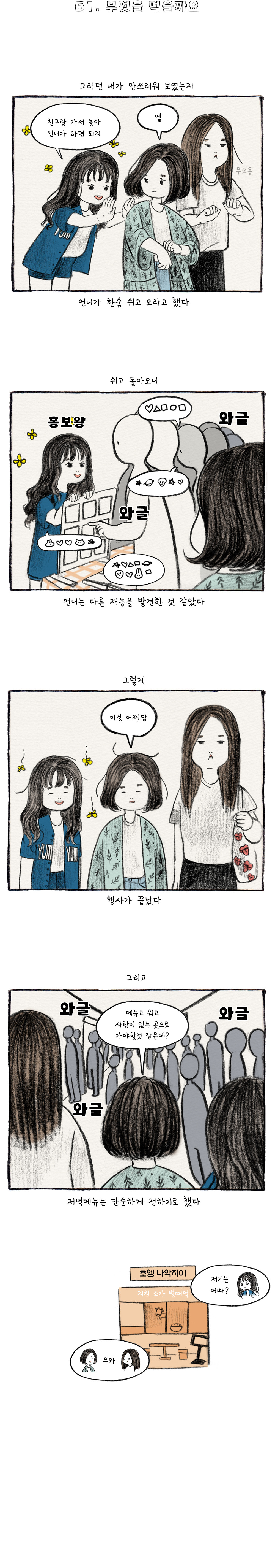주머니에 넣어둔 작은 손난로처럼 소소하지만 따스한 그림을 그리고 있습니다. 마음이 따뜻해지면 세상이 몽글몽글 부드러워보이지 않을까요?