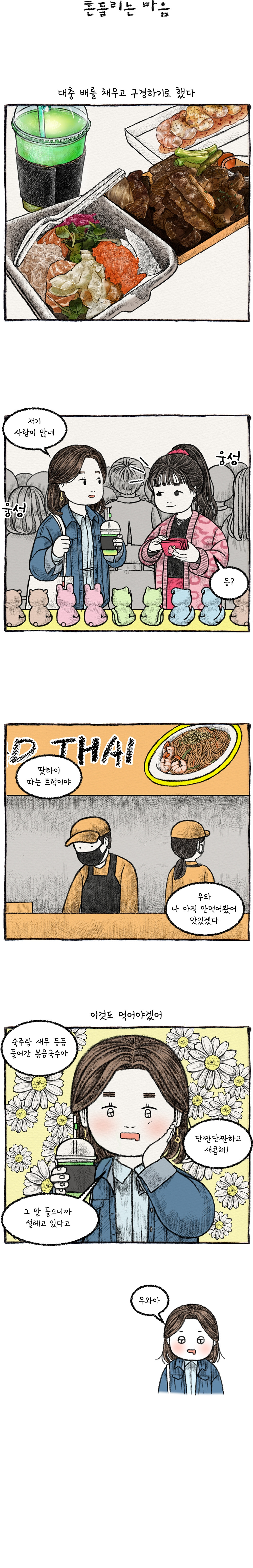 주머니에 넣어둔 작은 손난로처럼 소소하지만 따스한 그림을 그리고 있습니다. 마음이 따뜻해지면 세상이 몽글몽글 부드러워보이지 않을까요?