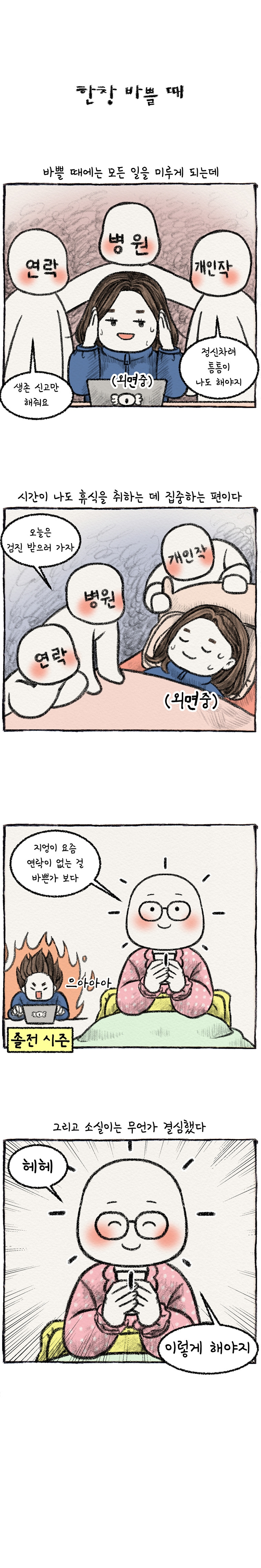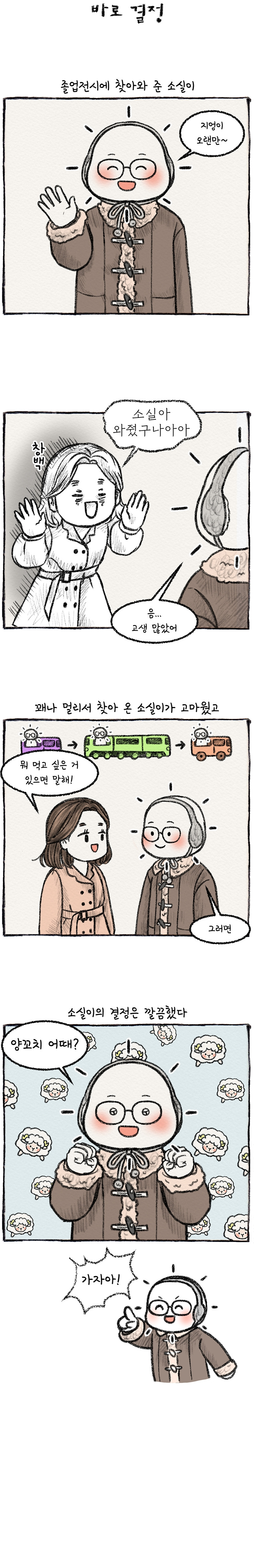 주머니에 넣어둔 작은 손난로처럼 소소하지만 따스한 그림을 그리고 있습니다. 마음이 따뜻해지면 세상이 몽글몽글 부드러워보이지 않을까요?