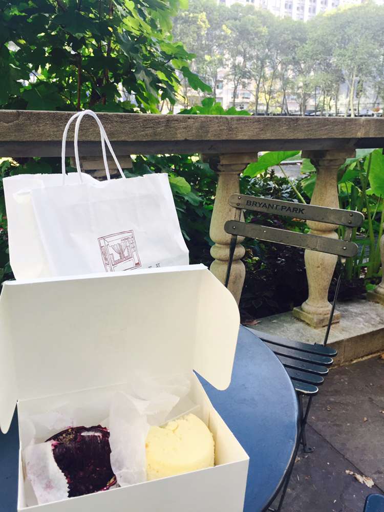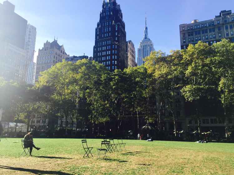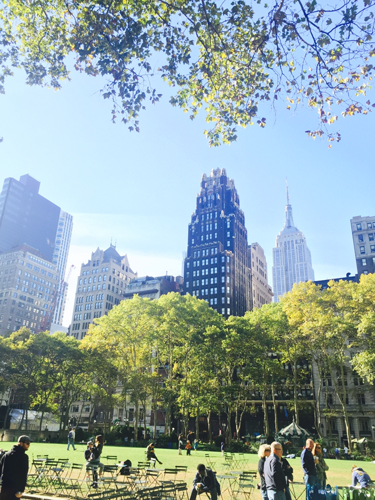 그렇게 햇빛이 서서히 비추는 거리들을 구경하며 도착한 브라이언트 파크도 전날 점심시간보다 한가로웠다. 새들의 지저귐을 들으며 빵을 먹기시작했다. 빽빽한 건물들 사이로 네모낳게 구멍이 나듯 생긴 브라이언트 파크 위에는 그렇게 네모난 햇살이 비추고 있었다.