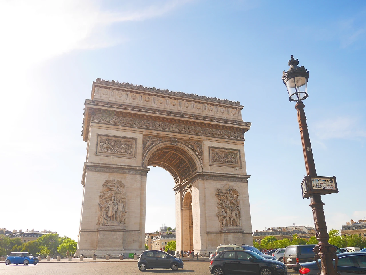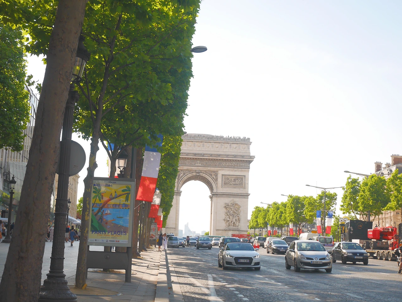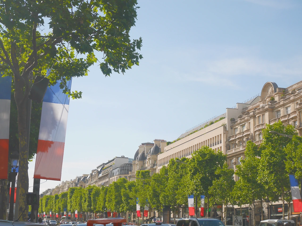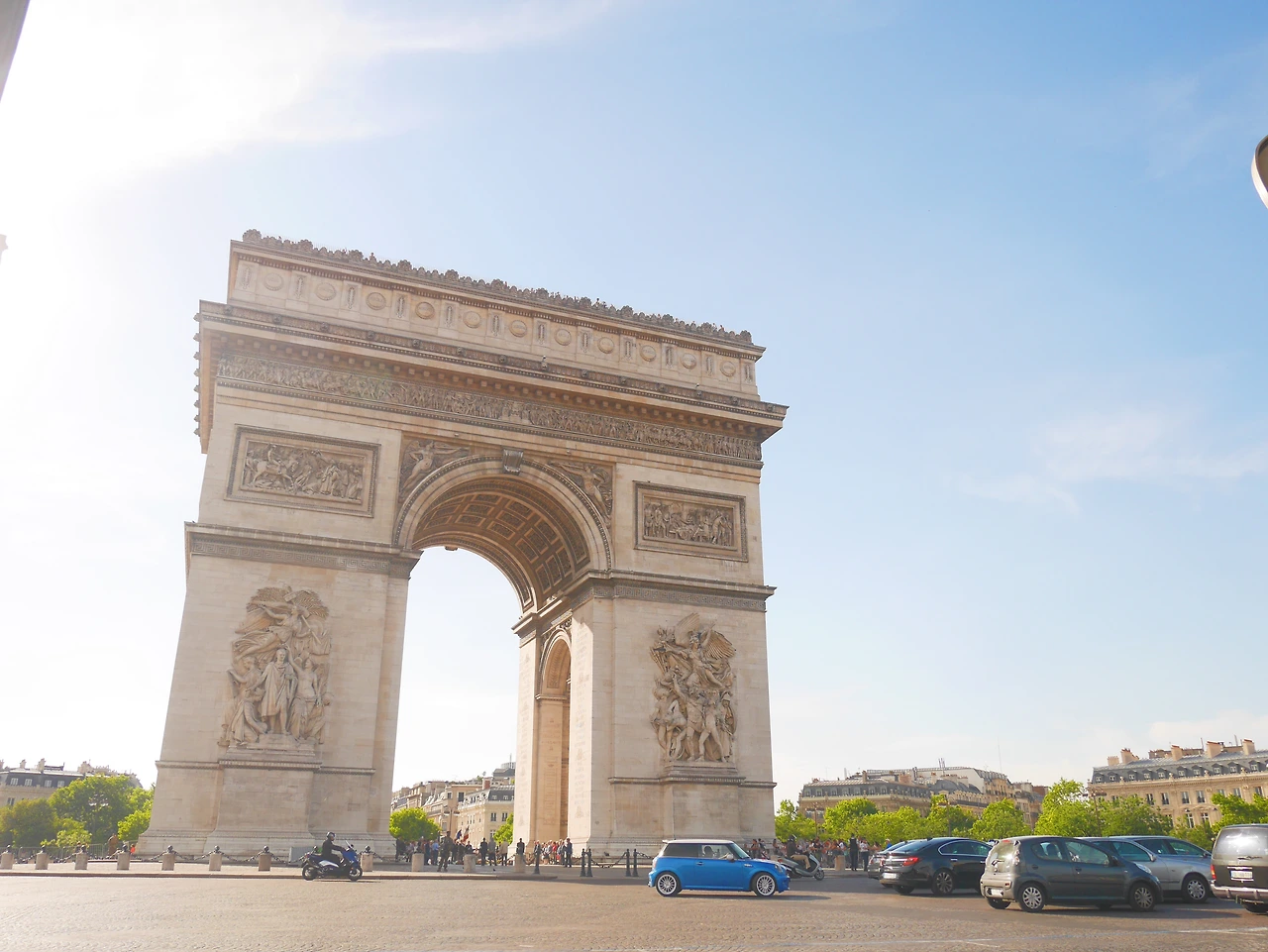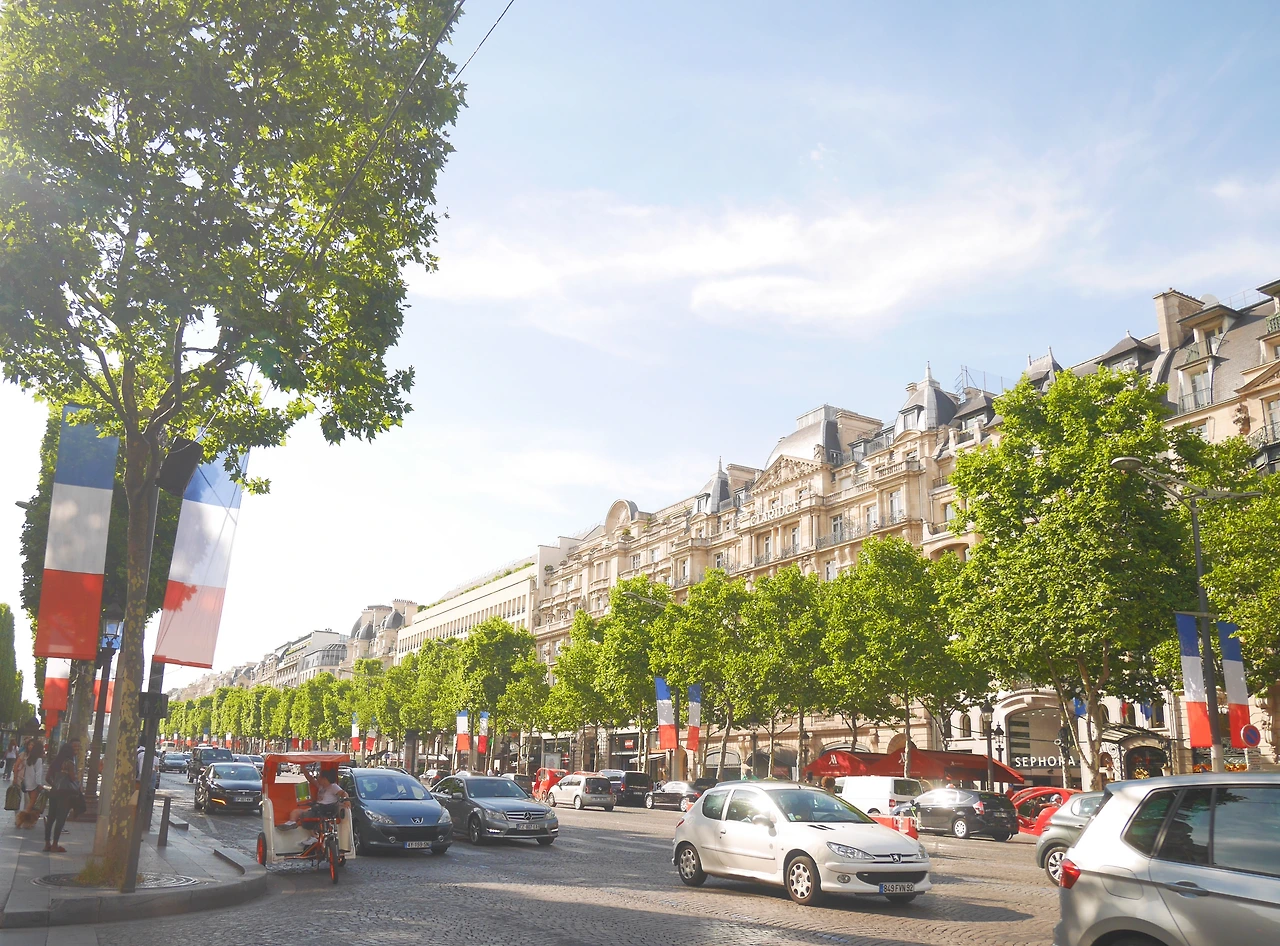 분명 여기가 샹제리제 거리가 맞는데, 그동안 미디어를 통해 접하고 내가 상상한 그런 느낌이 아니었다. 일섭할배처럼 인력거를 타고 가지 않아서 일까. 그 느낌은 아니었지만 큰 상점들과 네모난 나무와 부대끼는 프랑스 국기 그리고 저 앞에 서있는 개선문 까지 샹제리제거리였다. 거리에 서서 바라본 샹제리제 거리 끝에 자리한 개선문과 가까이에서 바라본 개선문은 달랐다.