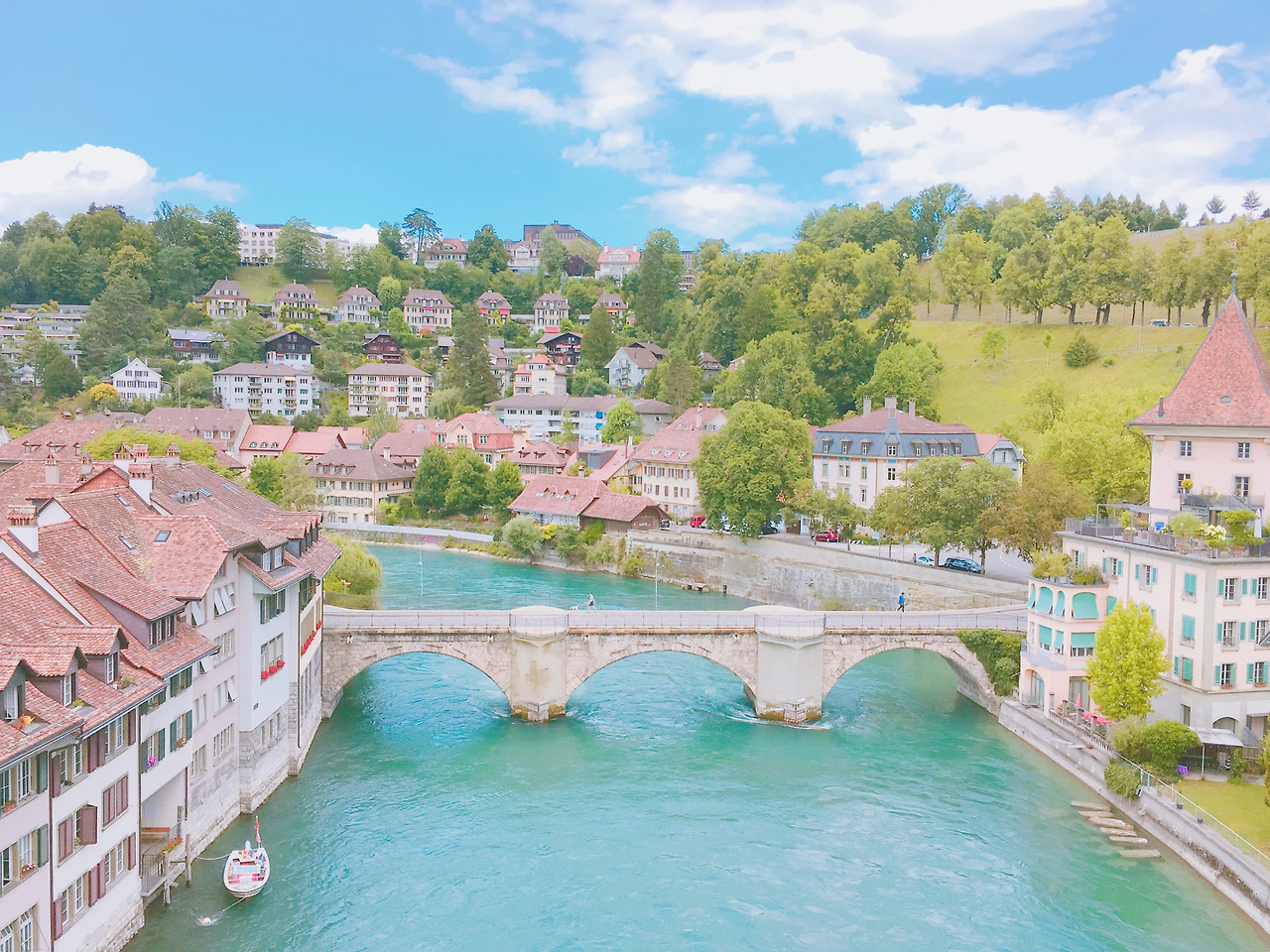 베른의 풍경을 내려다 보기위해 장미 공원으로 가는 도중 강물을 잇는 다리를 지나야했다. 푸르른 나무속의 갈색 지붕의 집들 그리고 그 사이를 흐르는 강물과 그 위의 또 다시 작은 다리. 이 노래만 끝나면 다시 걸어야지, 하며 다섯 곡 정도를 그냥 흘러보냈다.