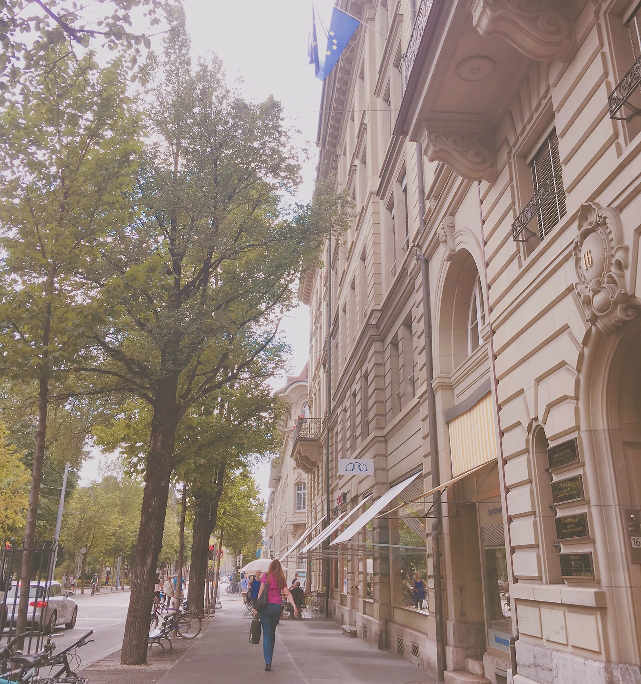 아직도 기억이 나는 곳이 있다. 역에 다다를때 쯤, 내 앞에 있던 거리의 모습이었다. 지금 내가 걷는 곳이 이어지는 그 앞의 모습, 여느 유럽거리와 다르지 않는 가로수들과 유럽의 건물들 사이의 풍경이었다. 아직도 그 모습이 왜 그토록 좋았는지 이해가 되진 않는다. 어쩌면 한국에서도 만날 수 있는 그저그런 풍경이었다. 베이지색, 파리의 건물들과 비슷한 깔끔한 건물들과 드문드문 걸린 차양과 깃발, 길가에 자리잡은 풍성한 나무들과 그 사이로 들어온 햇살이 비추는 그 거리. 횡단보도의 빨간불 표시와 그 건너편에 또 다른 공원의 모습.