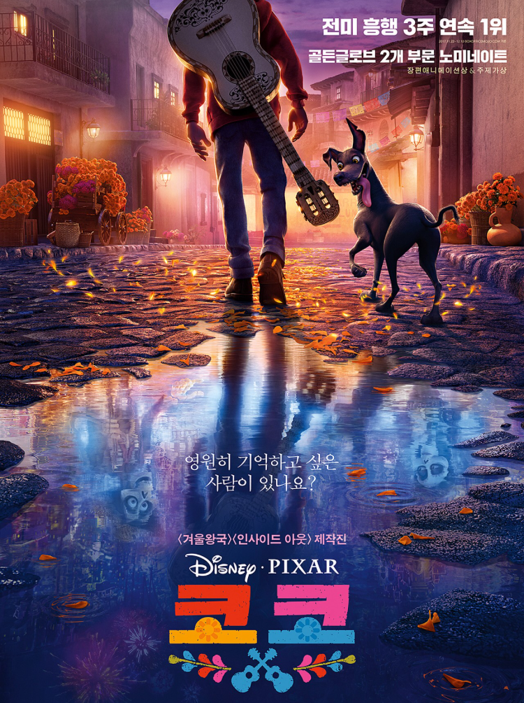 영화 초반부와 후반부에 잠깐 나오는 코코가 이 영화의 제목인 이유는 무엇일까. 코코처럼 떠난 이를 기억하는 모든 이 들에게 전하고 싶은 말이, 이 영화가 말하고자 하는 바이기 때문은 아닐까.