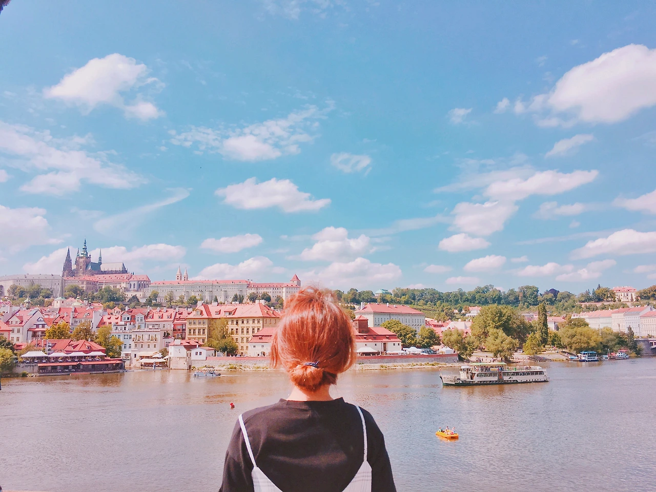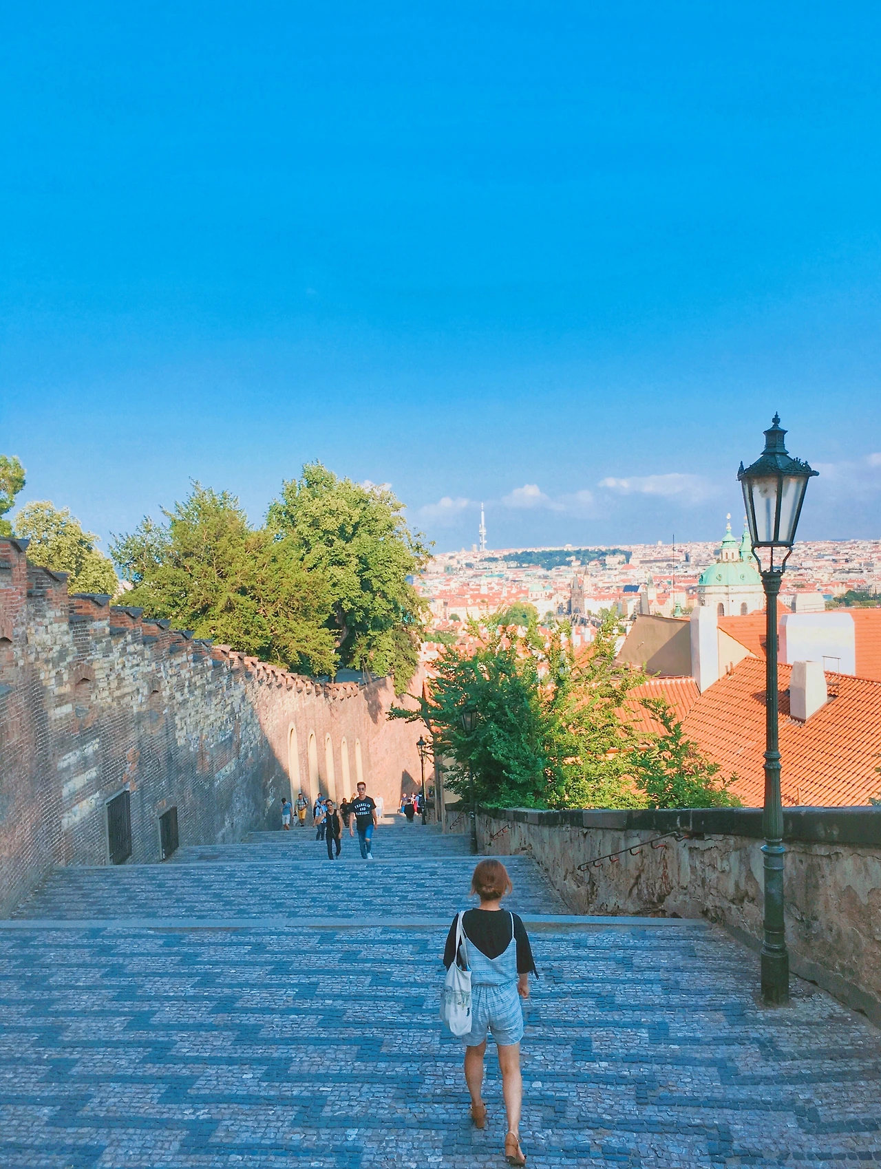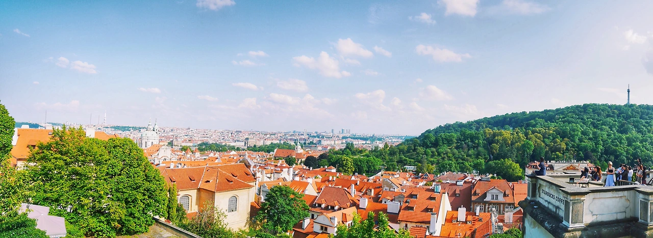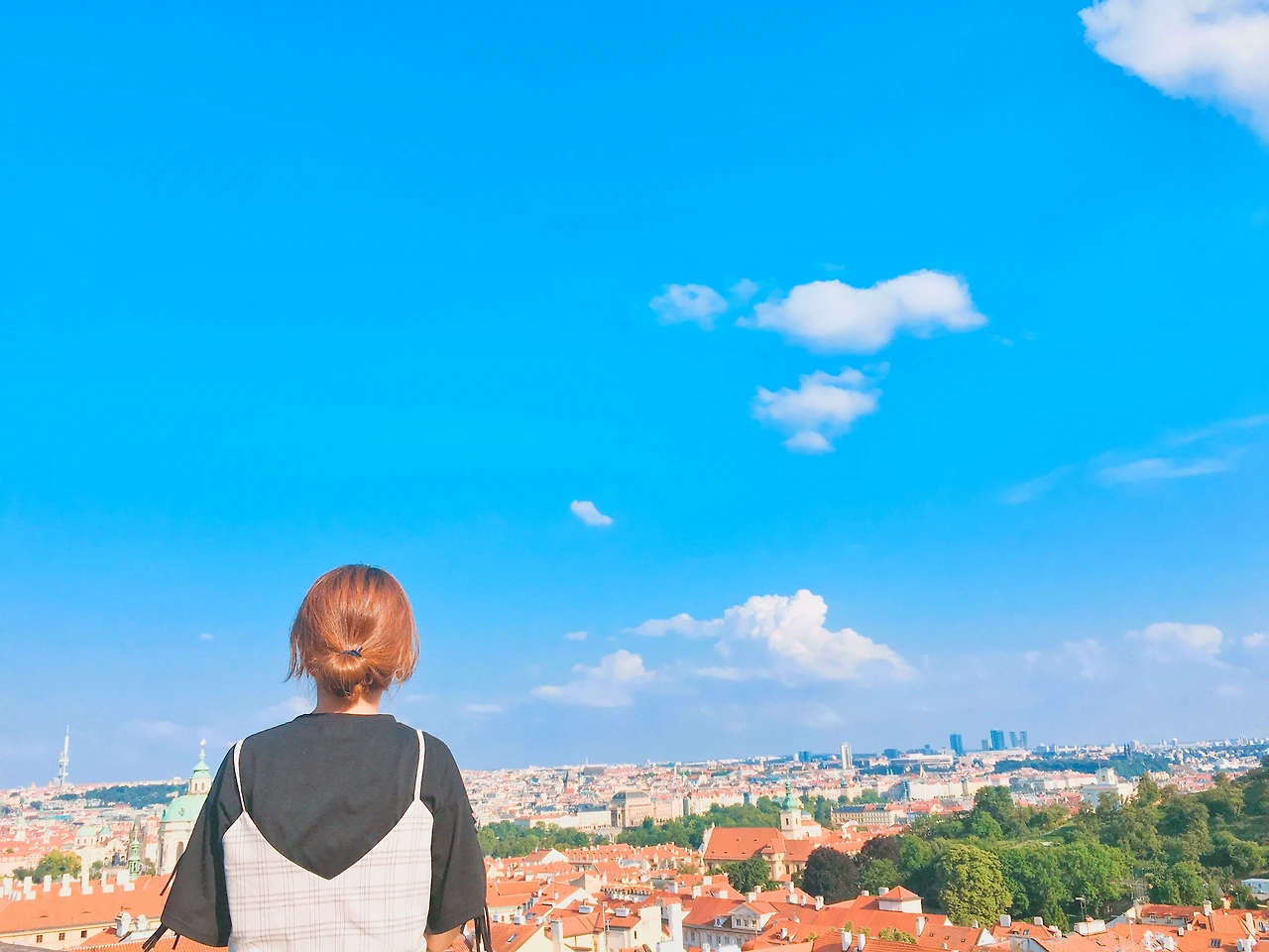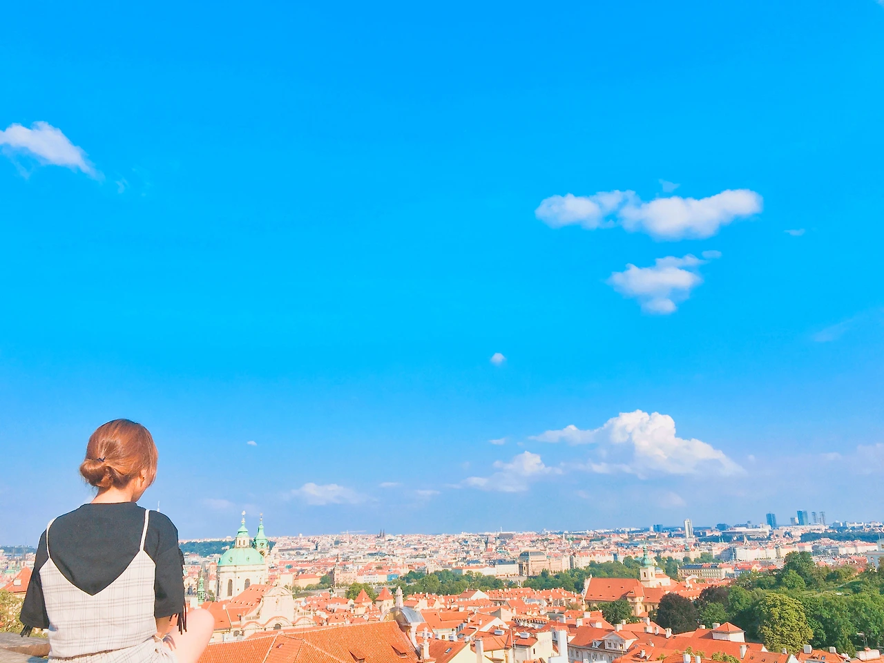 푸른 하늘 위 뭉게지어 떠다니는 구름, 그리고 그 밑에 옹기종기 모여있는 빨간 지붕들 까지.. 이따금씩 웨딩사진을 찍는 사람들이 지나간다. 가장 행복한 순간에 가장 행복한 모습 그대로를 담아내기 좋은 곳이라 생각했다. 이 작은 프라하는, 이 세상 누구보다 사랑하는 사람을 생각나게 한다. 그들의 미소가 환했다. 지금의 프라하 처럼,