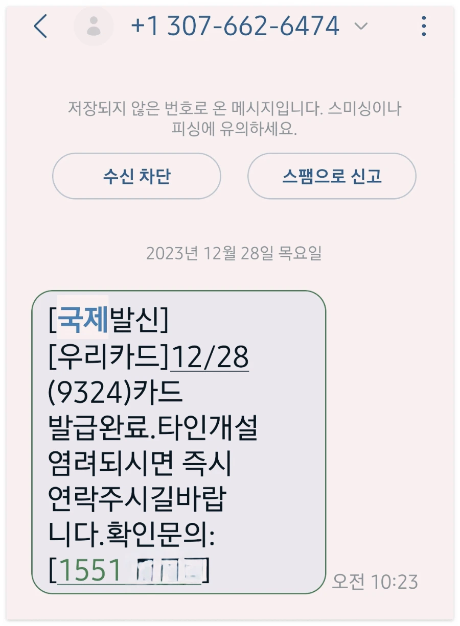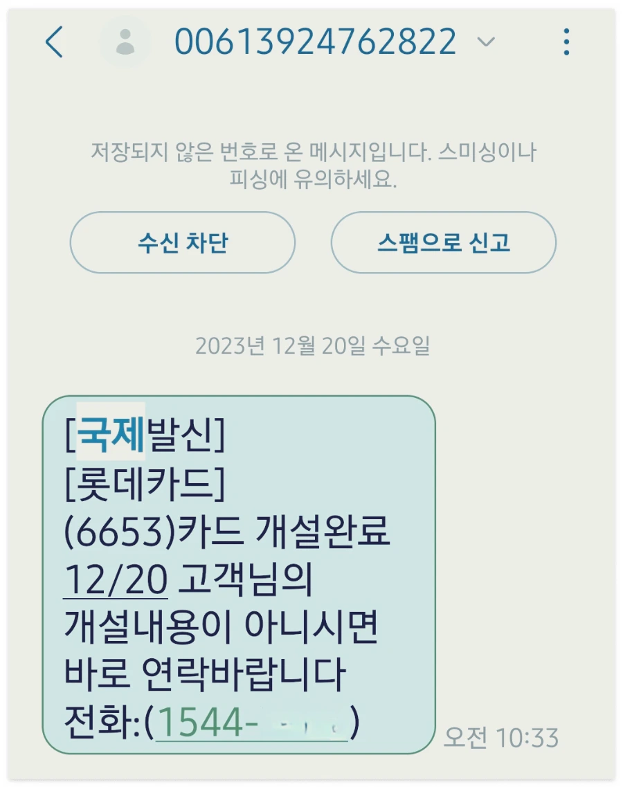 최근 언론기사에 의하면 국외 번호로 오던 사기 문자가 이제는 실제 카드회사 고객센터와 유사한 번호로 온다고 보도하고 있다. 이런 사기 문자는 결국 악성 앱을 설치하도록 유도하고, 이로 인해 많은 사람들이 피해를 입는다.