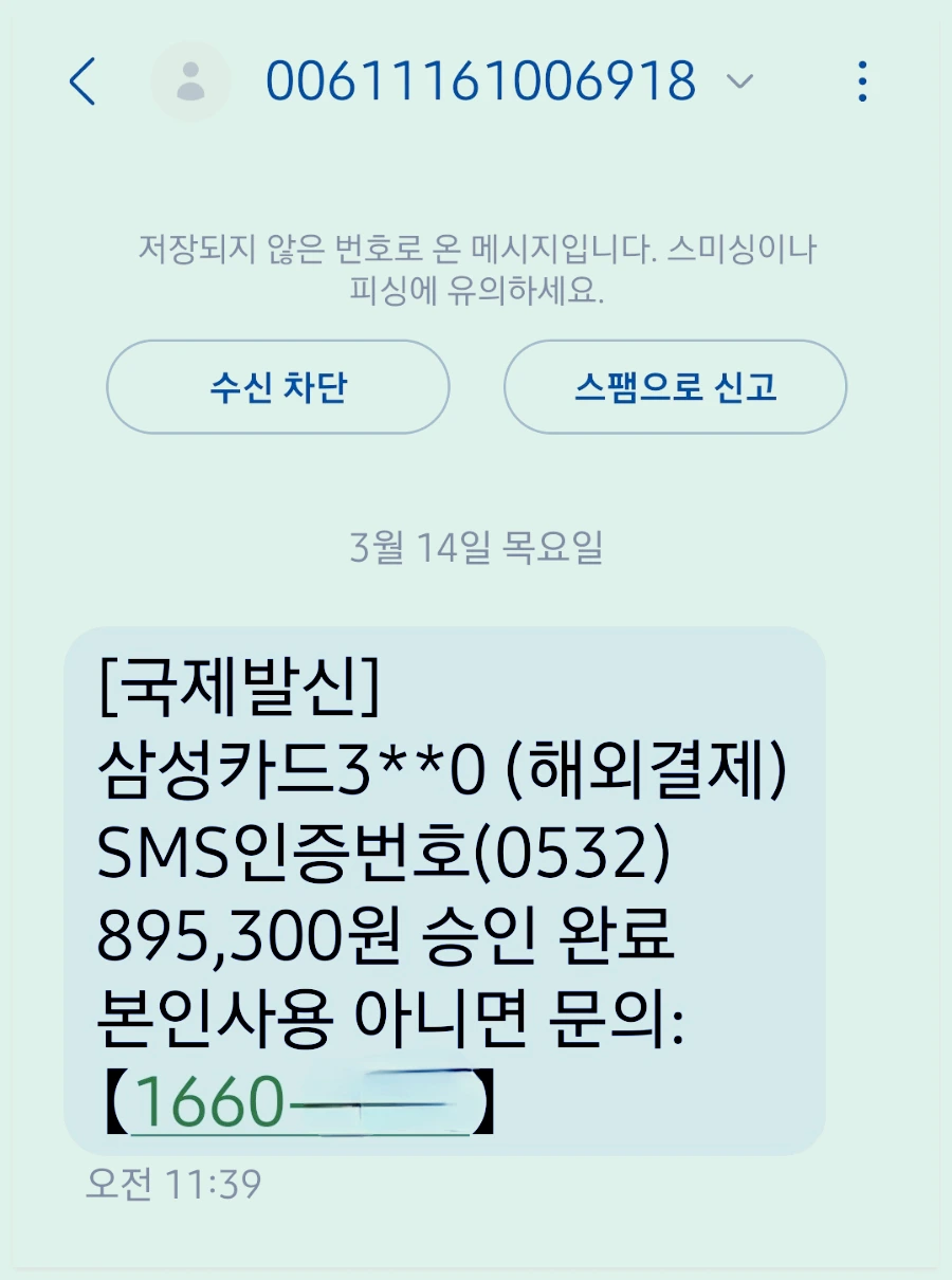 발신 문자에 신용카드회사 안심마크와 공식 채널로 진위 확인.