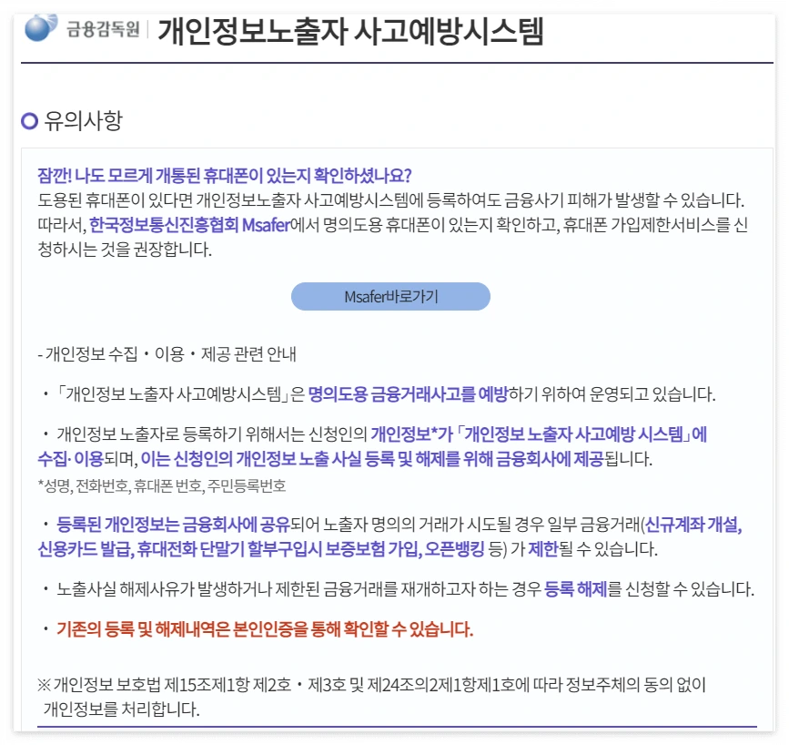 개인정보 노출자로 등록하면 신규 계좌개설, 신용카드 발급 등이 제한되어 추가적인 명의도용 피해 예방할 수 있다.