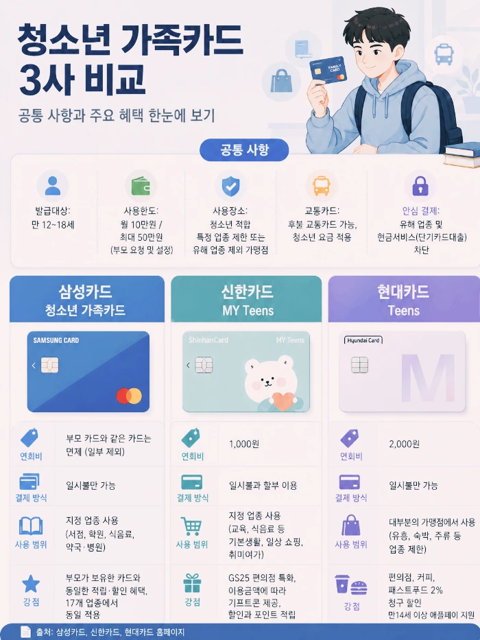 청소년 가족카드를 발급하는 신용카드사 중에 3개 회사를 보면,