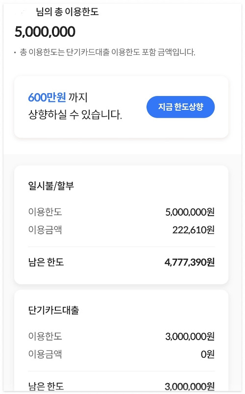 총 이용한도는 일시불과 할부(신용판매), 단기카드대출(현금서비스) 한도를 모두 포함한 금액을 말한다.