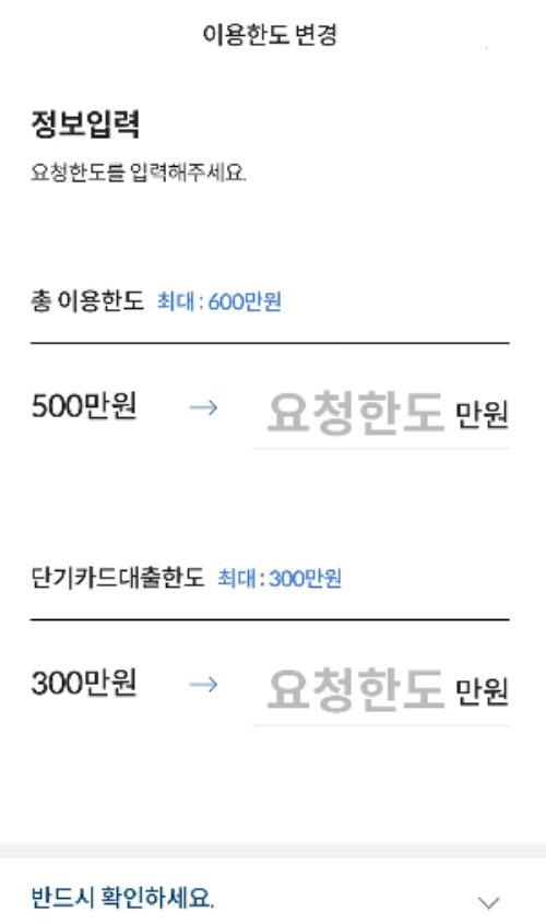 회원은 자신의 재정 상황에 맞게 한도를 늘이거나 줄이는 변경을 요청할 수 있다. 신용카드 모바일 앱, 홈페이지, 콜센터를 통해 신청할 수 있다
