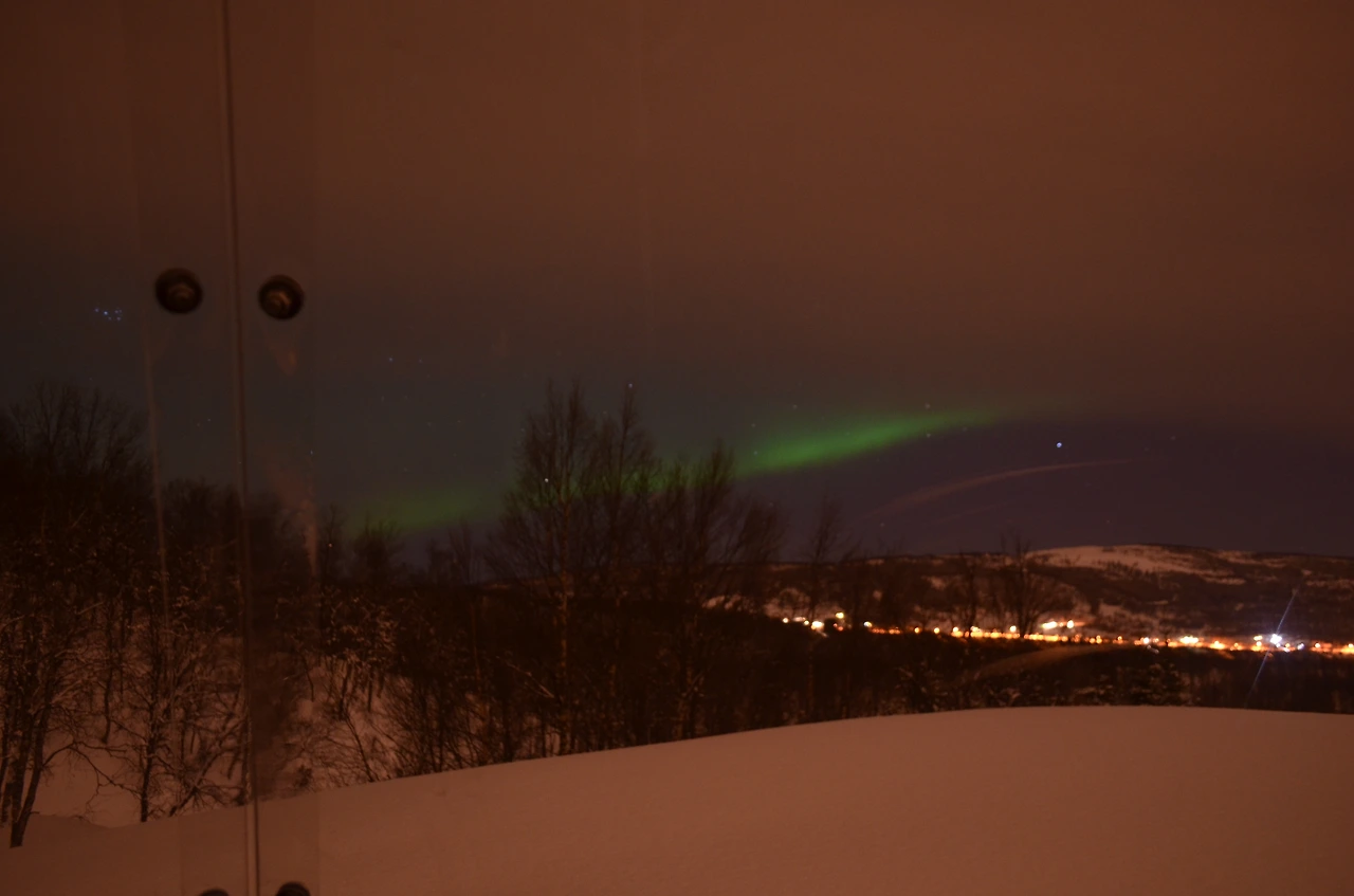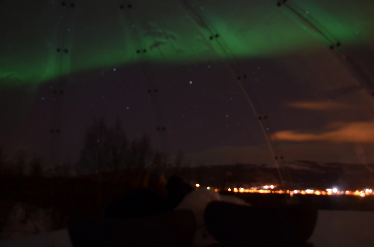 가지고 있는 방한 용품으로 무장을 하고 나간 전망돔에는 이미 서너 명의 사람들이 의자에 앉아 재잘거리고 있다. 저 멀리 선명한 오로라와 전망돔 사이에는 구름 하나가 걸려있어 아쉬움을 자아낸다. 아마 아까 급히 차에 탄 장비를 든 사람들의 목적지가 저곳이었겠거니 짐작한다.