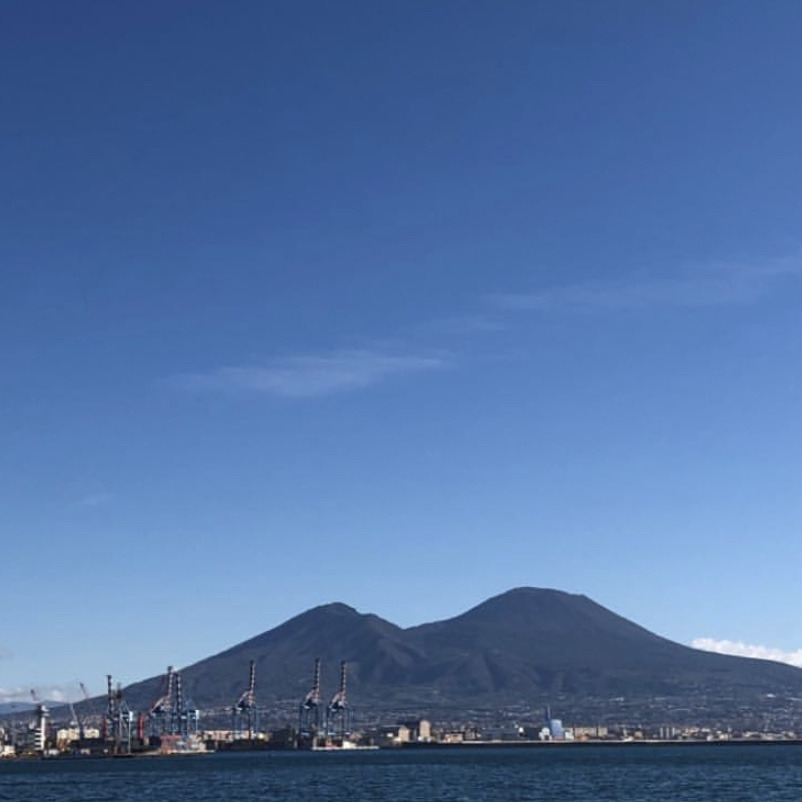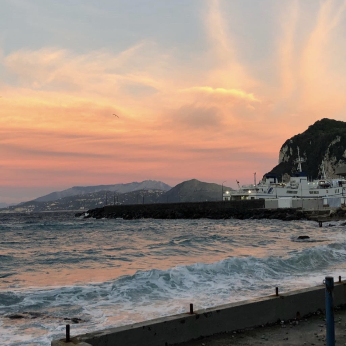 기둥 뒤에도 서봤다, 오토바이 옆에도 쭈그려 앉아보며 바람을 피하는 최적의 장소를 찾아다니던 중, 저 멀리 나폴리가 보이는 바닷가에 도달했다. 이곳에서 보니 세계 3대 미항이라는 말이 이해가 된다. 분홍빛 석양과 나폴리 항구의 빛이 합쳐져 아름다움을 더한다.