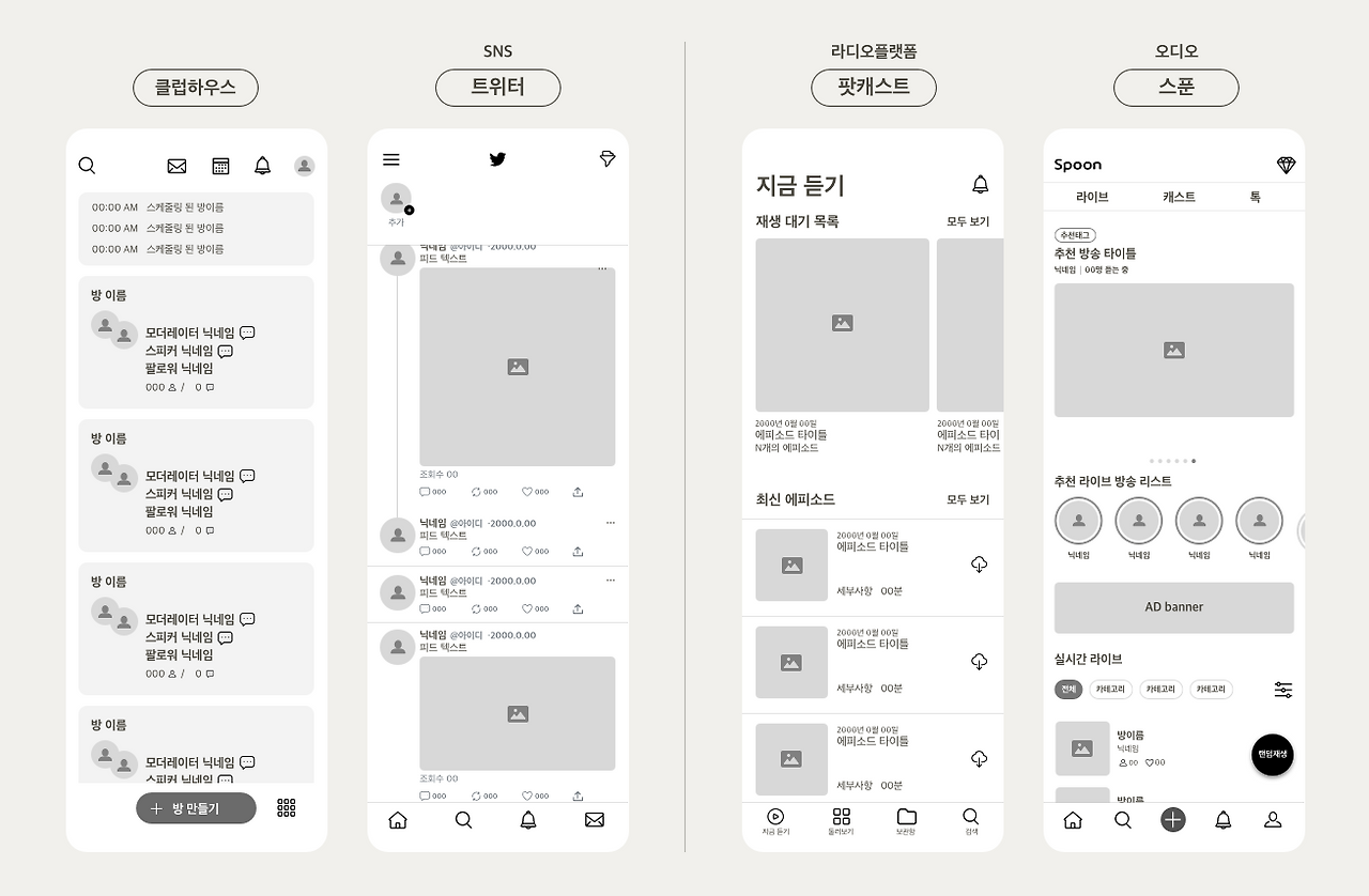어떤 부분에서 그런 생각이 드는 걸까? '클럽하우스'와 '트위터', 애플의 라디오 플랫폼 '팟캐스트', 국내 오디오 서비스인 '스푼'의 메인화면을 두고 비교해보자.