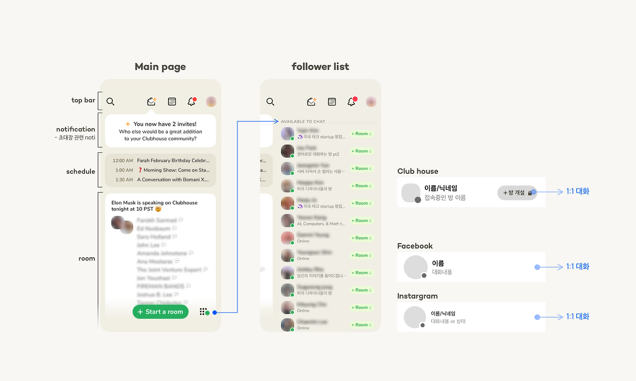 그다음으로는 follower list에서 알 수 있다. 위 이미지 우측 부분을 참고해보자. 음성 매체라 1:1 대화는 접속한 사람과만 할 수 있기 때문에 현재 접속한 사람들을 우선적으로 배치해둔 것을 제외하고는 페이스북과 인스타그램의 디렉트 메시지와 동일한 구조로 구성되어있는 것을 알 수 있다.