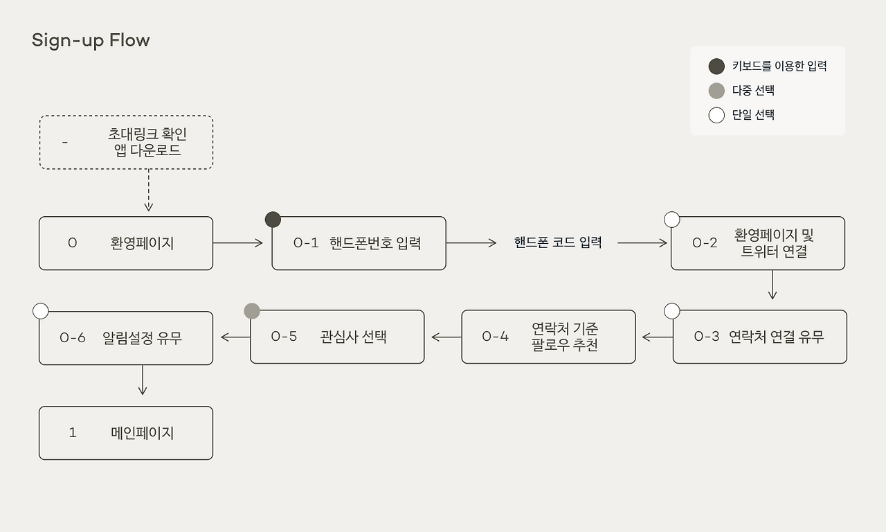 6단계 중 유저가 무언가를 '행동'해야 하는 순간은 다섯 번이 있었다. 하지만 이 중 입력 또는 여러 개를 선택해야 하는 순간은 단 두 번이 있었다. 그마저도 한 번은 핸드폰 번호 입력으로, 생각하지 않고 할 수 있는 단순 입력이며 결론적으로 잠시 머무르며 고민해야 하는 페이지는 0-5번의 '관심사 선택 페이지' 뿐이었다.