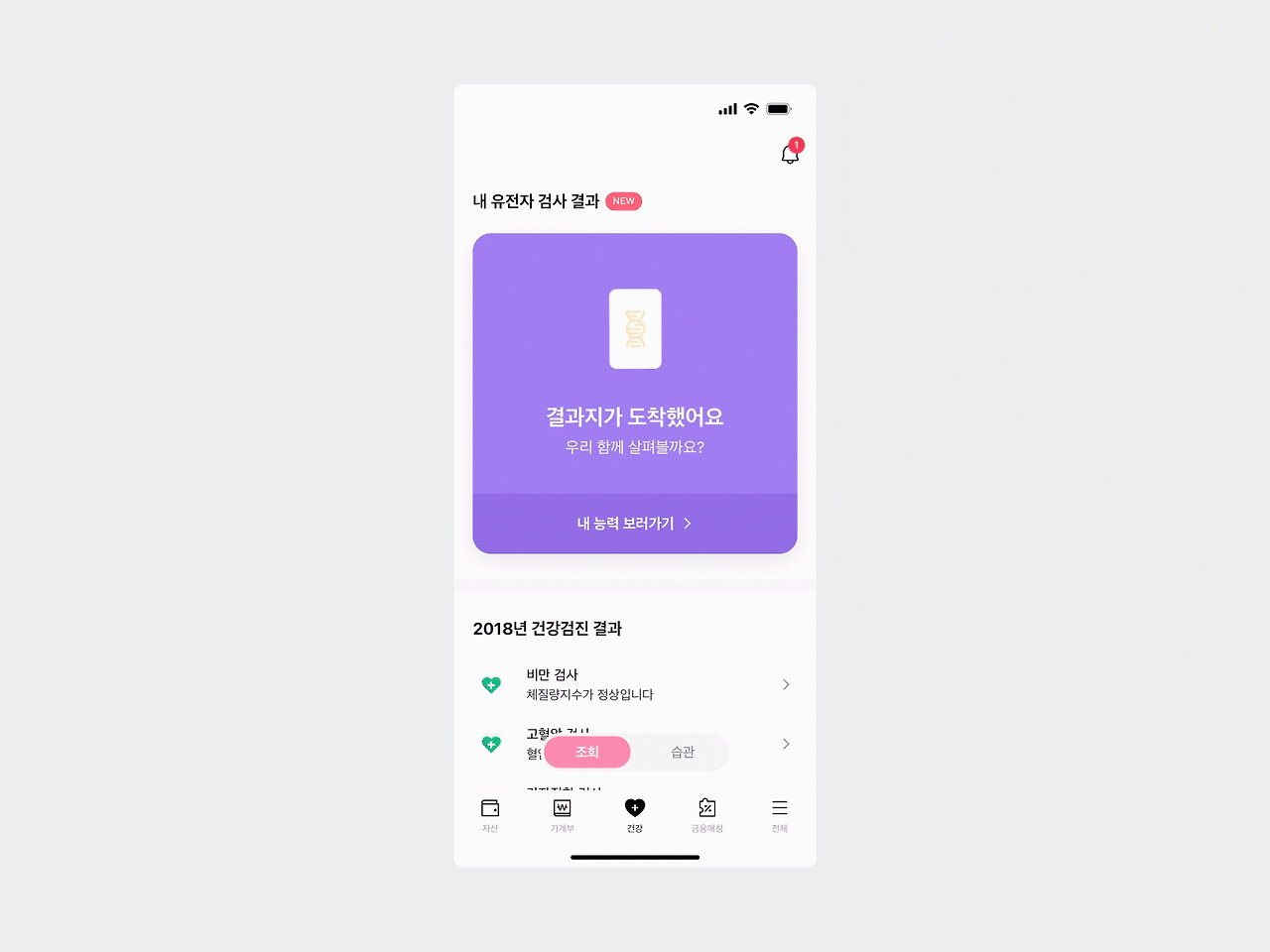 아래 이미지는 유전자 검사 결과를 볼 수 있는 화면이다. 보통 결과가 도착했다는 것을 이미지화한다면 우편을 모티브로 한 일러스트나 인터렉션을 보여준다. 하지만 뱅크샐러드의 경우에는 카드 3장이 보인다. (마치 타로카드처럼 보이기도 한다.)