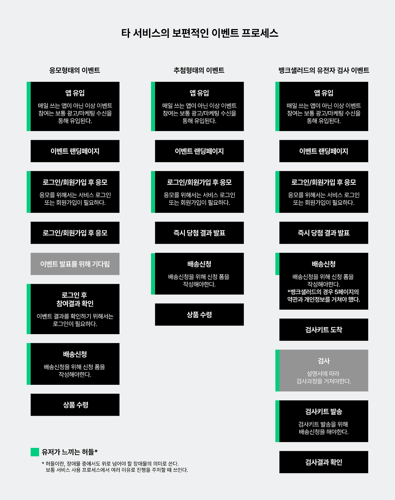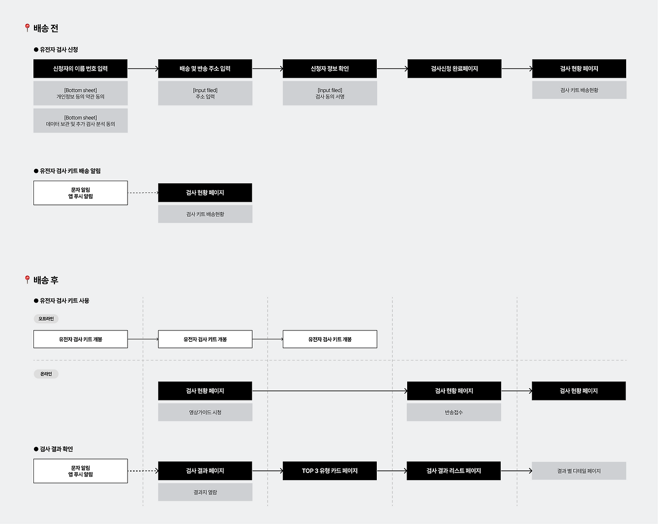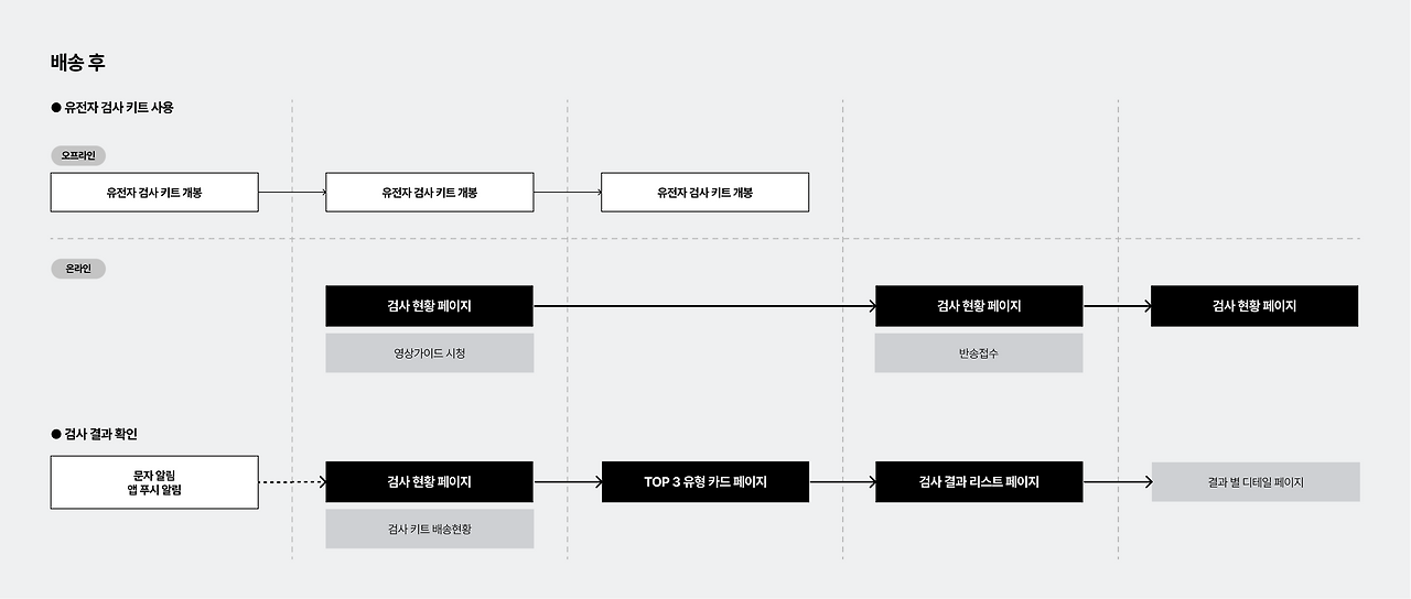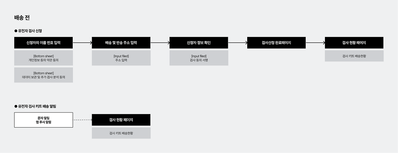 이벤트 당첨 이후의 프로세스를 <유전자 검사 신청 플로우>, <유전자 검사 키트 배송 알림>, <유전자 검사 키트 사용>, <검사 결과 확인>으로 분류하여 분석해보자.