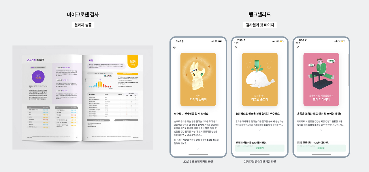 뱅크샐러드의 유전자 검사 프로세스에서 개인적으로 가장 좋았다고 느꼈던 점 중 하나가 바로 이 페이지이다. 아래 첫 번째 이미지는 뱅크샐러드의 유전자 검사를 맡고 있는 기관인 '마이크로젠'의 검사결과지 샘플이다. 건강검진 이후 받게 되는 pdf처럼 유전자 검사 결과지도 유사한 형태라는 것을 알 수 있다. 잘 정리가 되어있지만 지면보다는 스크린에 익숙한 본인에게는 한눈에 바로 들어오지 않는다.