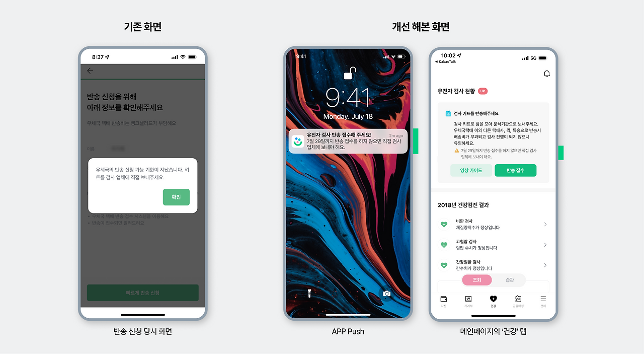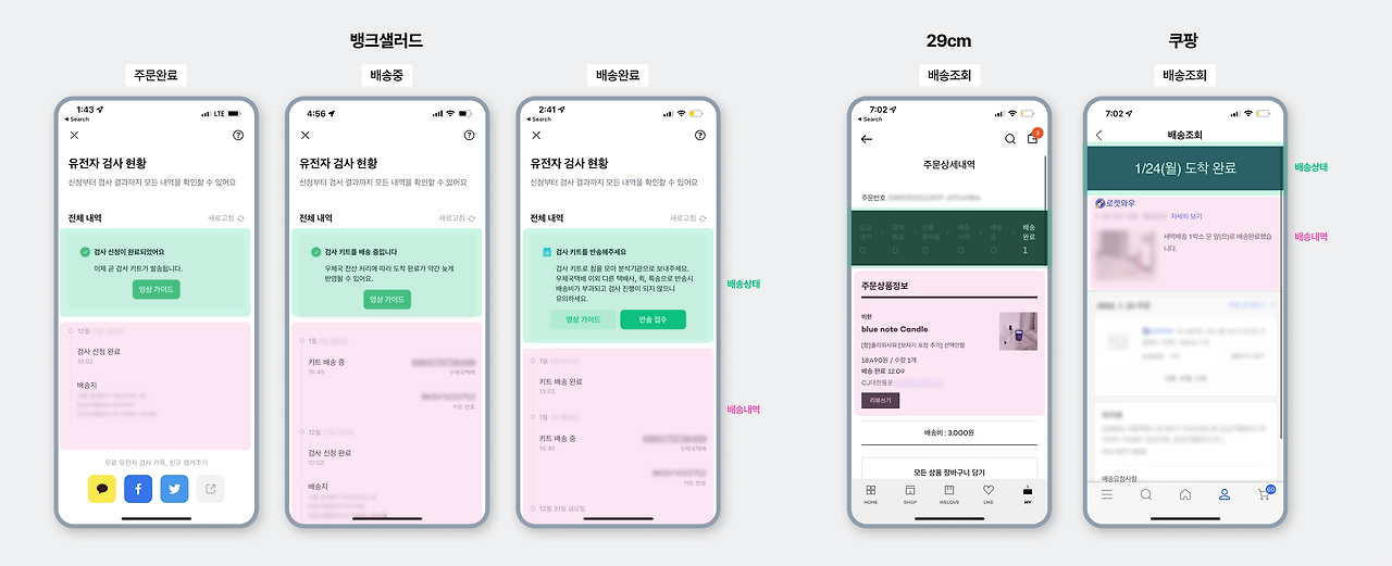 배송상태와 배송내역도 흔히 볼 수 있는 영역에 위치해 있었다. (이 부분은 고객 입장에서 배송 내역보다 배송상태가 화면 내의 우선순위가 높기 때문에 동일한 위치를 사용했다고 유추할 수 있다.) 또한 배송 상태에 따라 해당 영역이 변경되는 것도 동일하다. 뱅크샐러드의 경우, 검사 키트가 도착한 후 [반송 접수] 버튼이 추가되었다. 커머스들 또한 배송이 완료된 시점에서 앱 화면이 배송 완료로 바뀌며 [리뷰 쓰기] [교환 및 반품] 등의 버튼이 추가된다. 앱 푸시도 배송상태에 따라서 전송되었고 이 또한 커머스와 동일하게 볼 수 있었다.