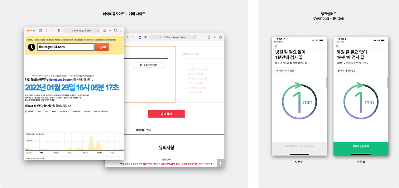 이 글을 읽고 있는 대부분의 사람들은 대학교 수강신청, 콘서트 티켓팅, 명절 기차 예매 등의 '선착순 신청/예매'를 해본 적 있을 것이다. 그때마다 해당 사이트와 우측에는 네이비즘 사이트 창을 띄워두고 시작시간을 기다렸다. (제보에 따르면 인터파크 또는 멜론 티켓에서 CTA 카운트다운 기능을 제공하고 있다.) 하지만 뱅크샐러드는 그런 수고스러움이 필요 없었다. 바로 CTA에 카운트다운 요소를 사용하였기 때문이다.
