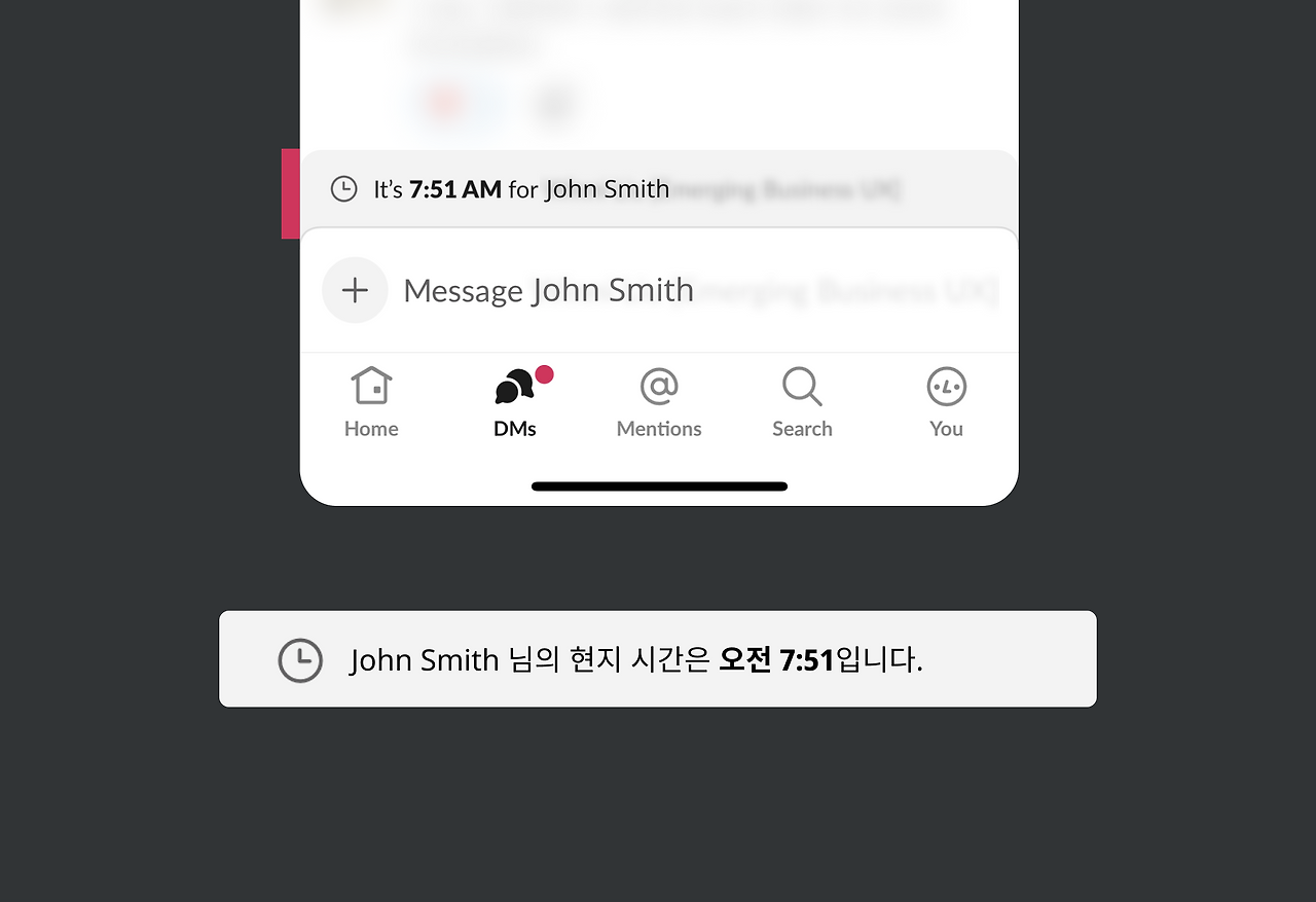 아마 메시지를 입력하는 필드 안에 Message John smith 대신 상대방의 시간을 알려 줄 수 있는 문구를 넣는 방법도 있을 거예요. 하지만 개인 화면에서 중요한 행동들 중 유저는 메시지를 보낼 수 있다.라는 부분과 충돌될 수 있어요. 왜냐하면 필드 안에 Message John smith는 메시지를 입력하는 부분이라는 것을 암시해 주는 지표이자 가이드거든요.